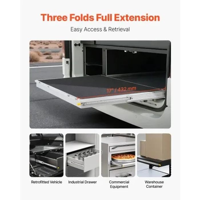 Coulisses triples pour tiroir : Vous recevrez une paire de coulisses avec verrou : 432 mm de long, 53 mm de large et 19,5 mm d’épaisseur. L’extension totale sur trois niveaux vous permet d’accéder à l’intégralité du tiroir. Un atout précieux pour optimiser l’espace de rangement !