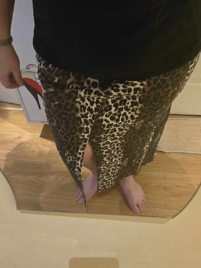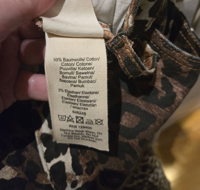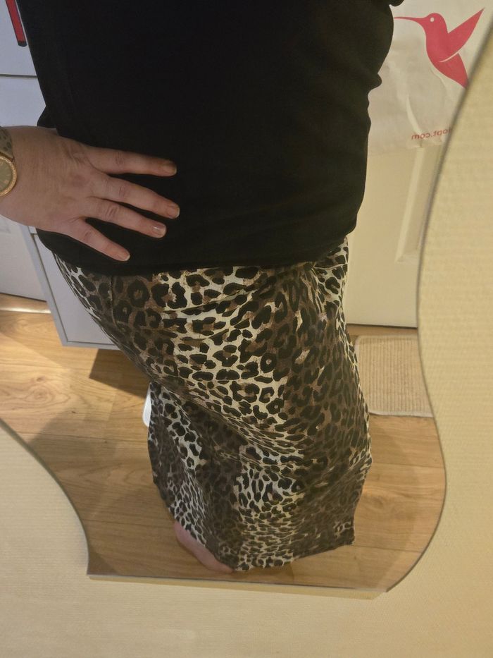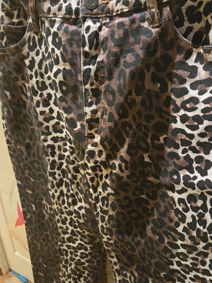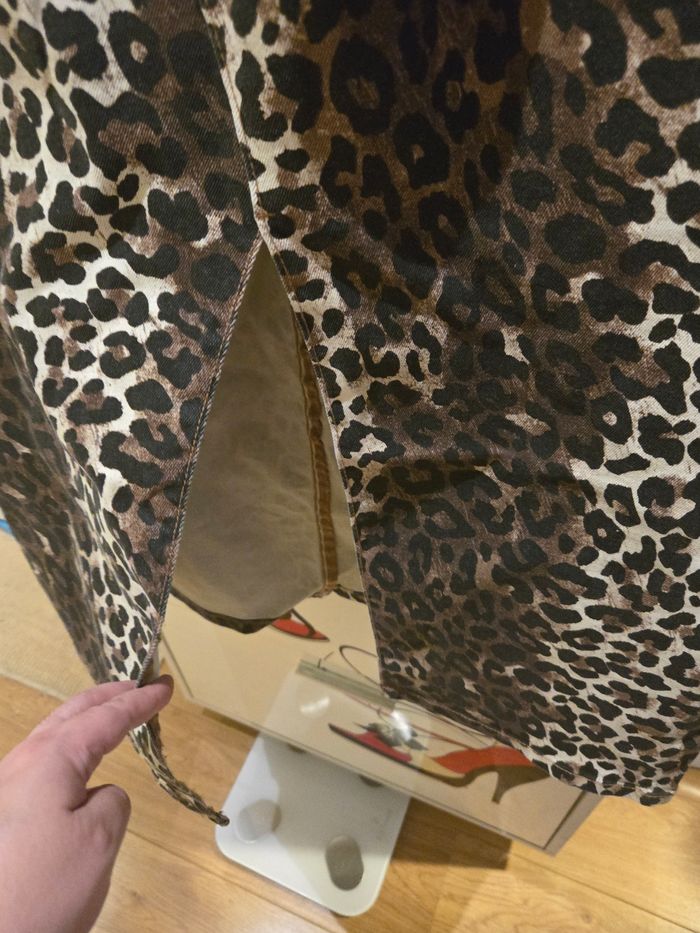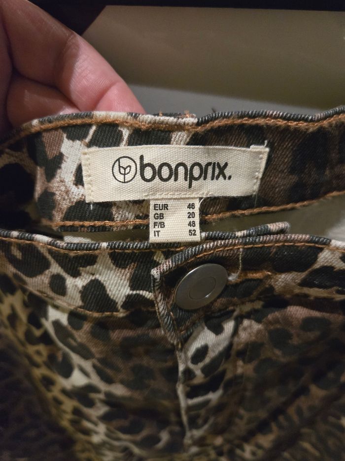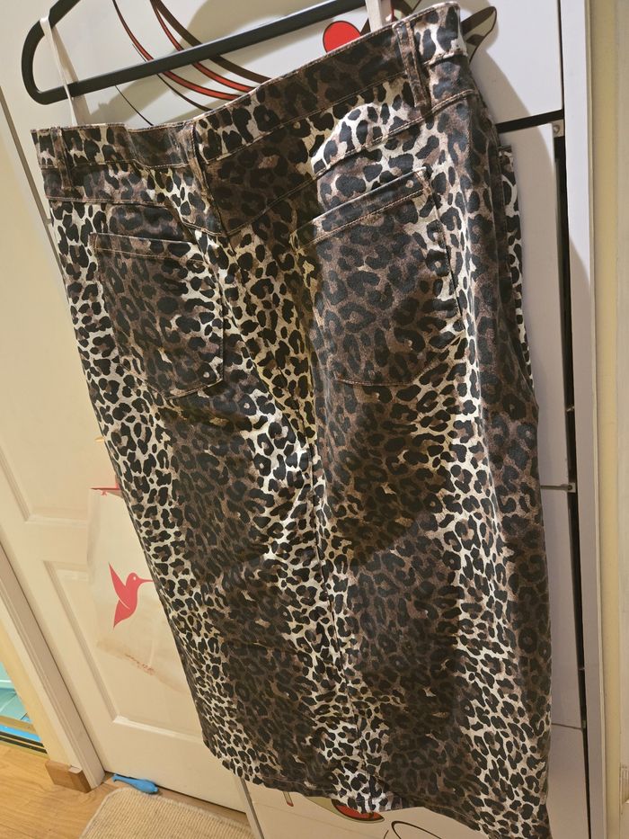 Jupe en jean beige à motifs léopard à la coupe droite, avec fente de 39 cm de long devant, 5 poches et 5 passants pour ceinture. Neuve / jamais portée. Marque : Bonprix. Neuf. Taille : 44/46. Dimensions : 46 cm de large à la taille, 56 cm de largeur en bas et 84 cm de longueur. Matières : 98% coton et 2% élasthanne. Pas d'échange, merci. Envoi rapide via Mondial Relay.