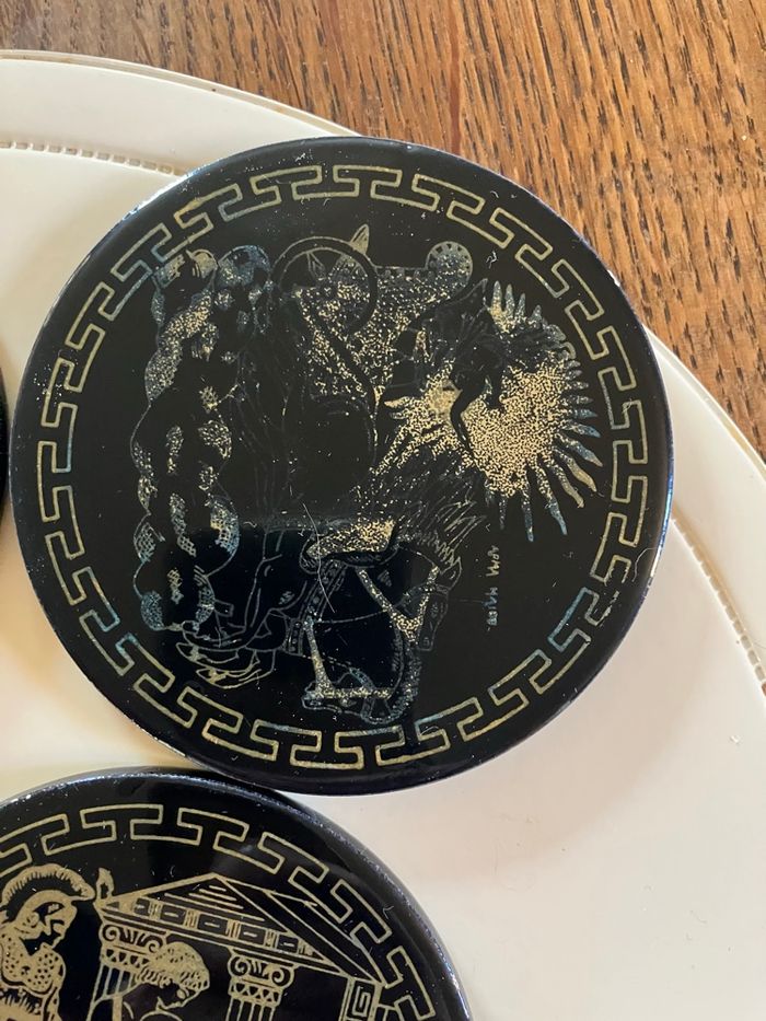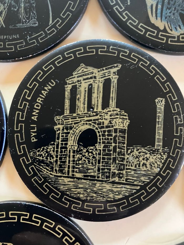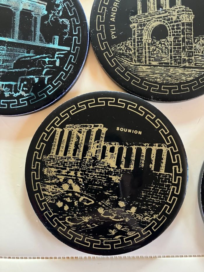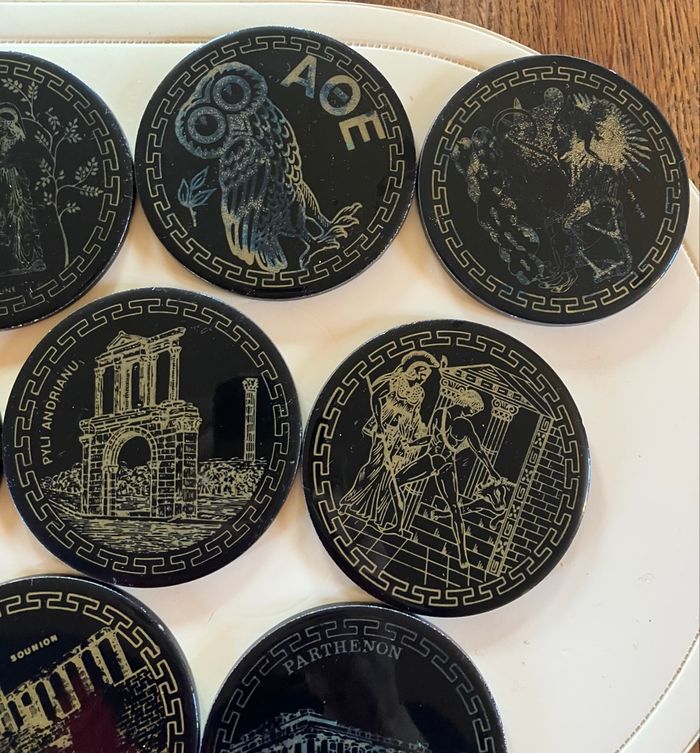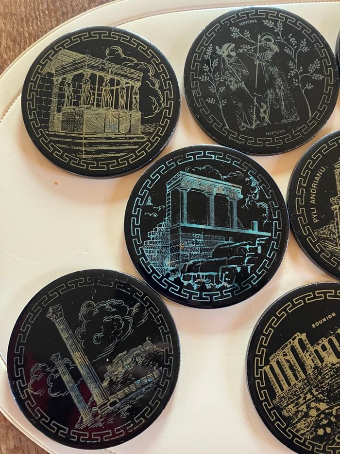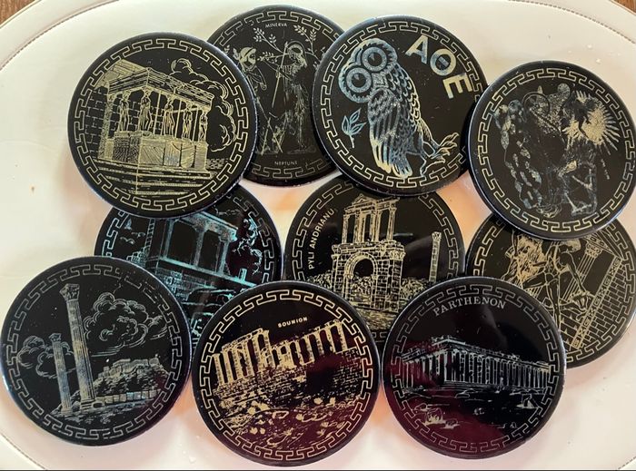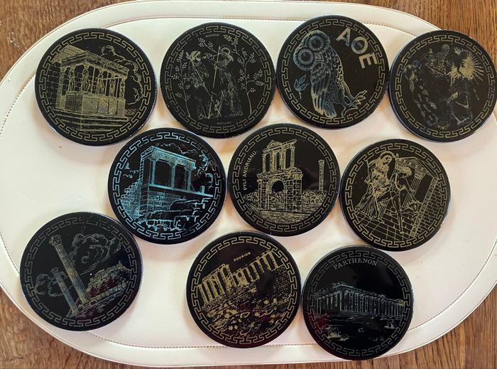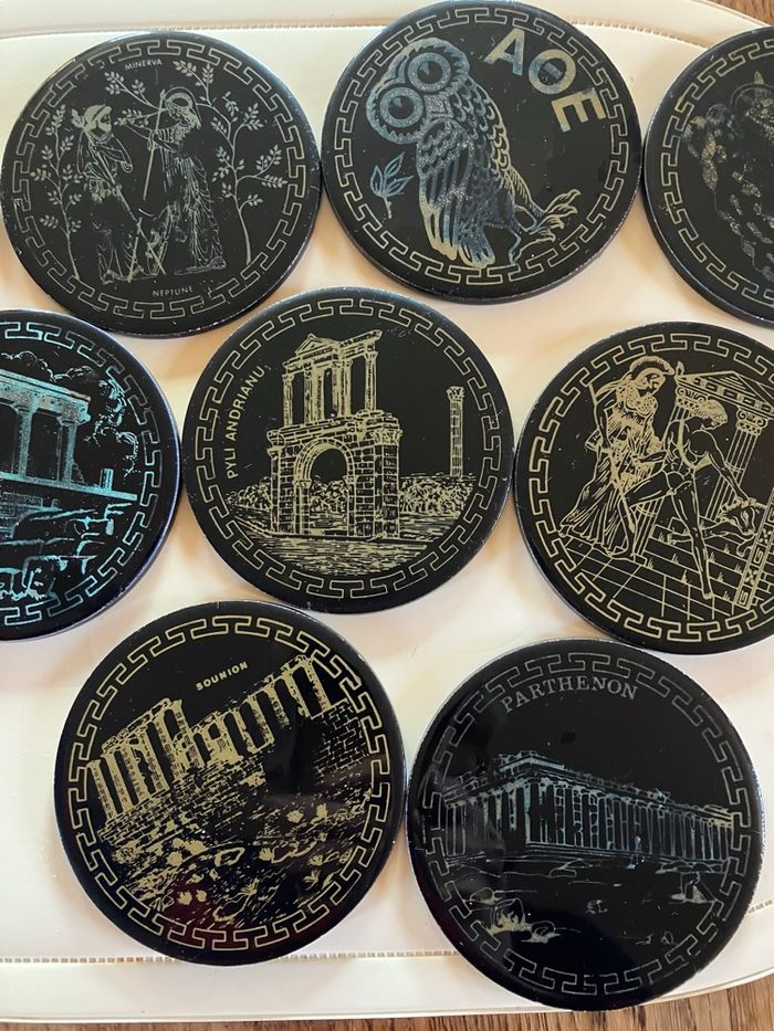 Ce lot comporte 10 sous-verres en bon état : ni ébréchures, ni fêlures ⚠️ toutefois ils ont été utilisés et certains motifs sont moins visibles Souvenir de la ville d’Athènes Vendus dans leur support Diamètre : 9 cm Épaisseur : 5 mm