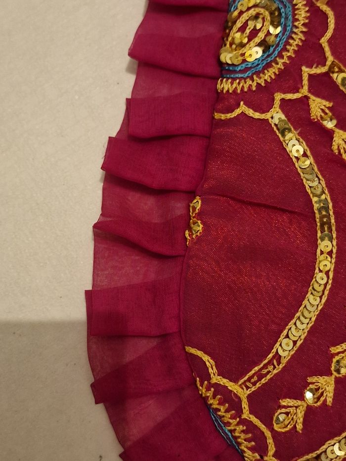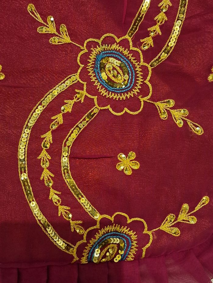 Design : Très jolies broderies de fils dorés et fleurs bleues, ornées de sequins dorés qui scintillent à la lumière.