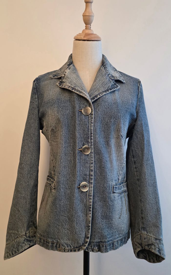 Veste en jean de marque Numéro Zero, taille L. Couleur bleu, 2 poches, fermeture par boutons. Longueur: 62cm