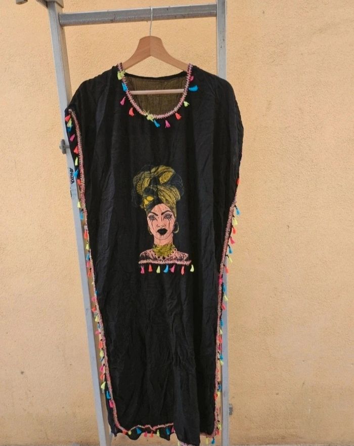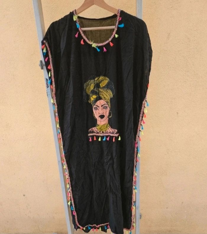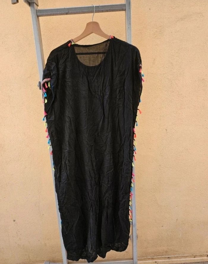 Abaya robe noir sans manche avec froufrou multicolore et imprimer