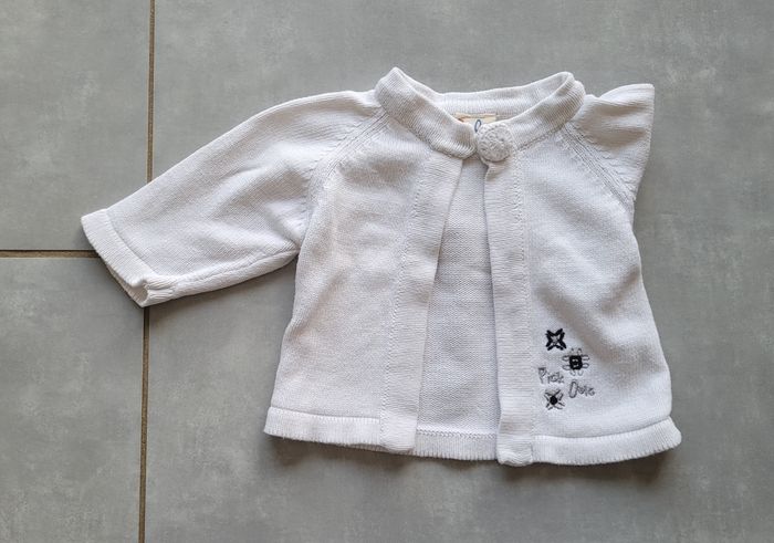 Gilet de couleur blanc avec motifs, de la marque Pick Ouic, taille 3 mois, en très bon état. Article lavé pour la vente.