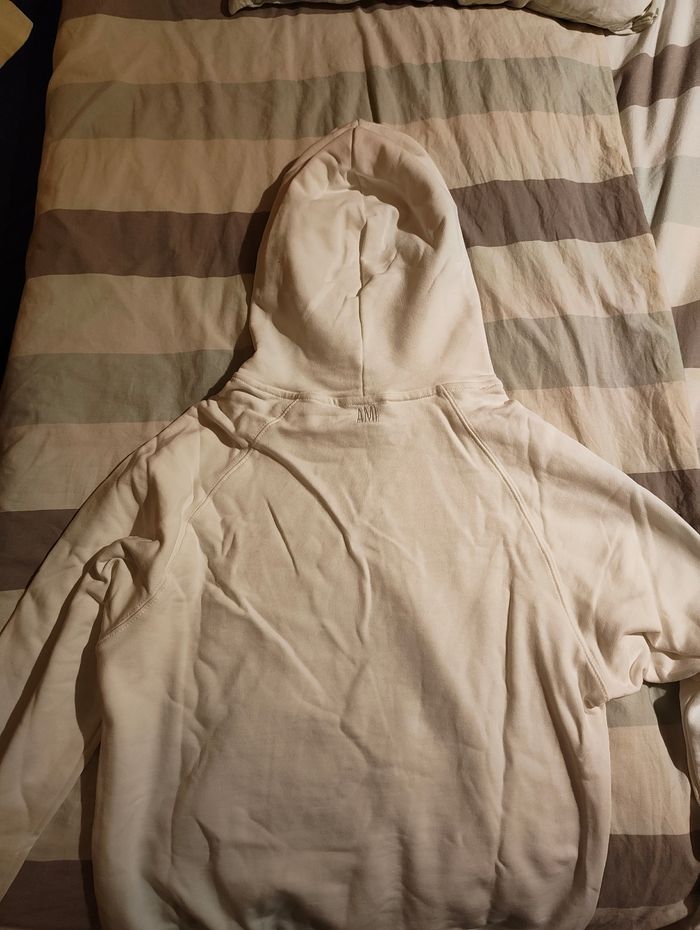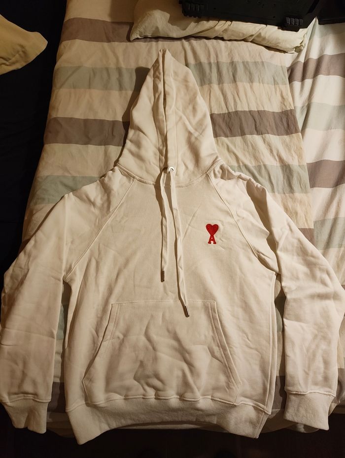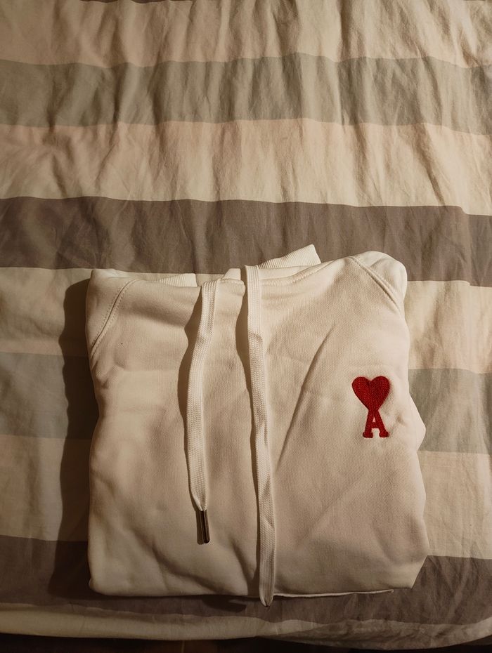 Hoodie AMI Paris authentique, coloris blanc, avec le logo AMI brodé en rouge sur la poitrine.