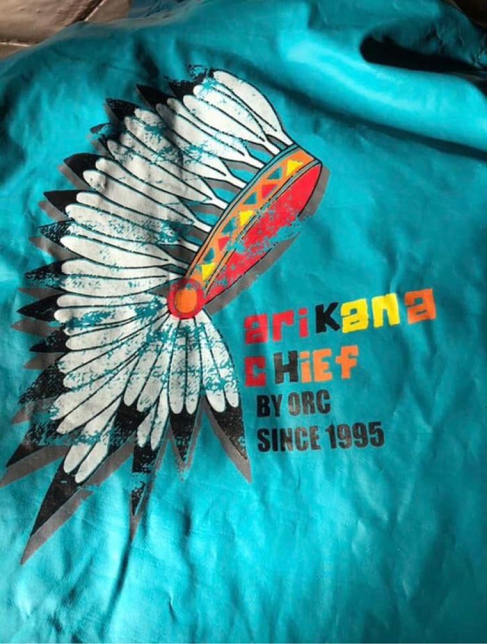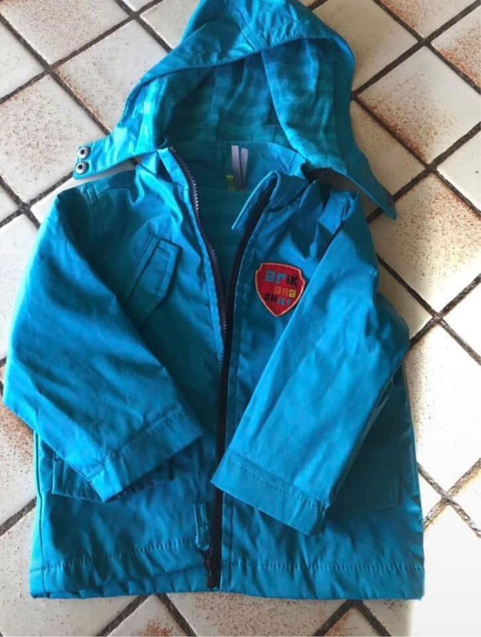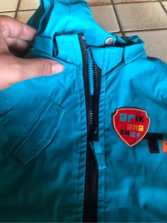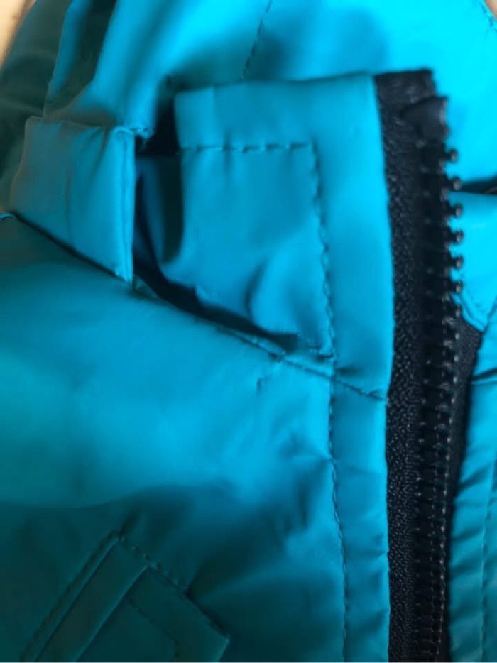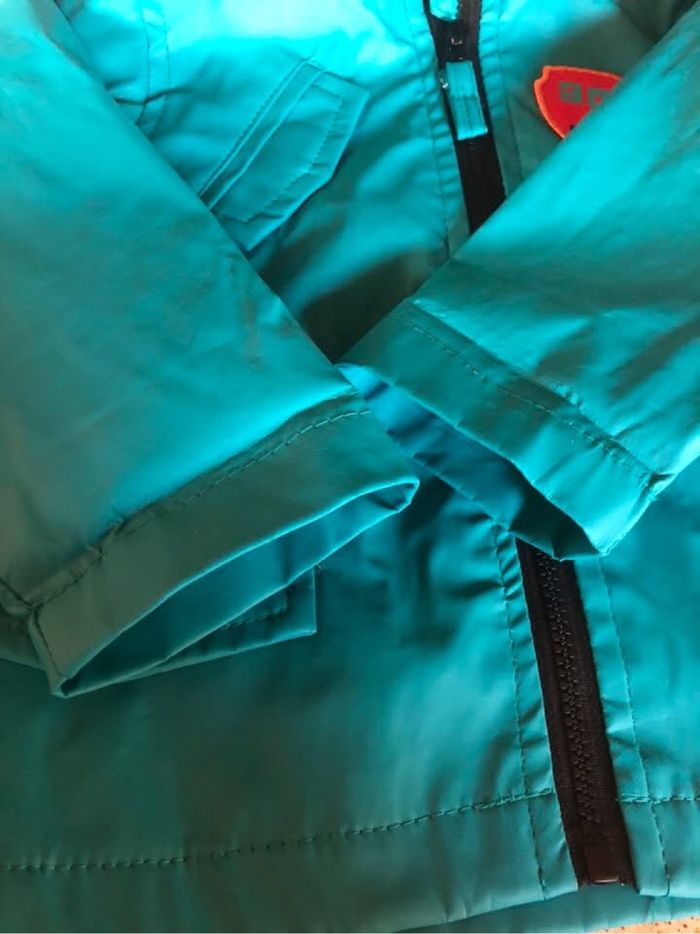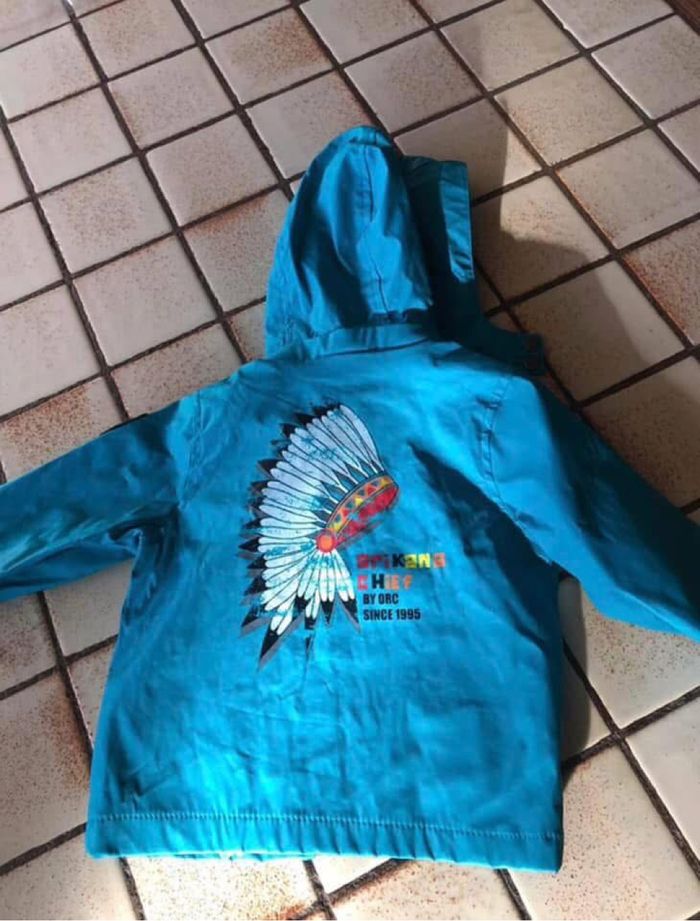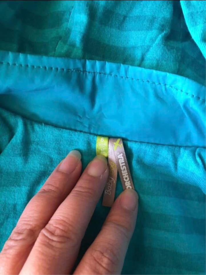 Ciré turquoise sur le thème indien. Marques: retournement des manches visibles Et marquage d’une étiquette de la marque à l’achat. Là où je pointe avec mon pouce. L’article reste cependant très bon.