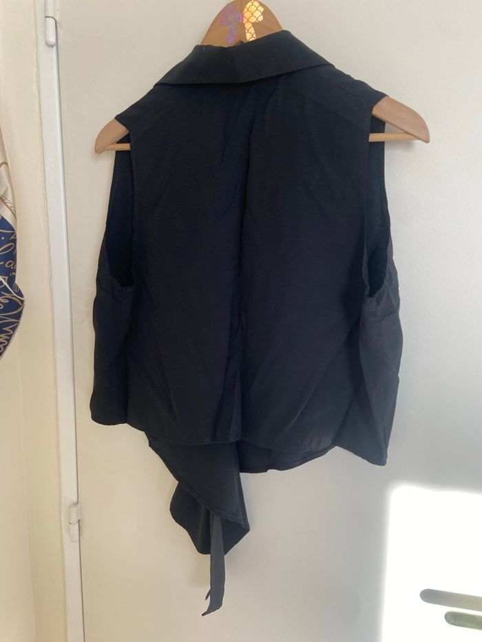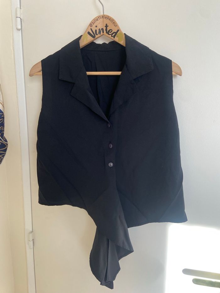 Haut noir, vintage, style chemise sans manches. Coupe élégante et intemporelle, facile à porter au quotidien.