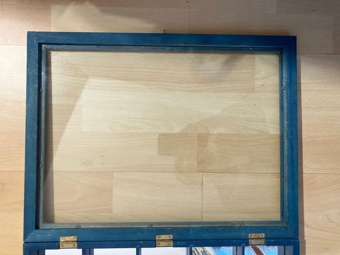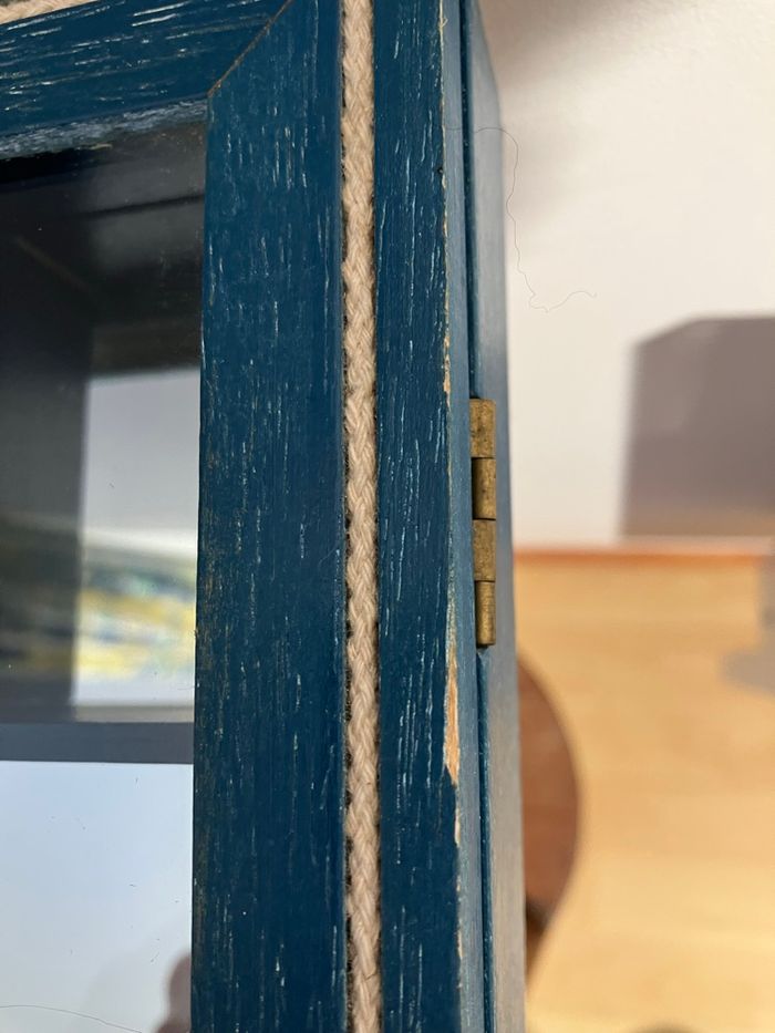 Jolie vitrine murale en bois peint bleu, avec façade vitrée et compartiments intérieurs. Elle est en bon état : pas de fêlure, pas d’ébréchure ⚠️ À noter une micro rayure d’environ 1 cm sur la vitre (voir photo) Idéale pour exposer des objets de collection, miniatures, souvenirs, dés à coudre, figurines ou objets déco. Style marin, peut être posée ou accrochée au mur. Dimensions de la vitrine : - hauteur : 41 cm - largeur : 31,2 cm - profondeur : 4,2 cm Dimensions des cases : - hauteur : 7,5 cm - profondeur : 2,5 cm - largeurs différentes : 11,5/9,5/7
