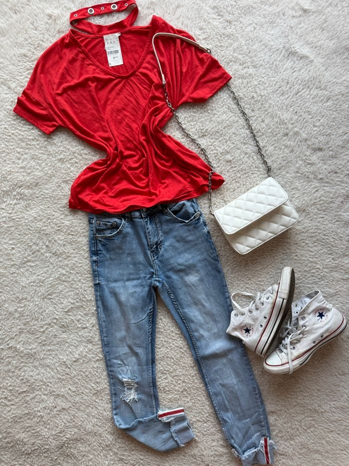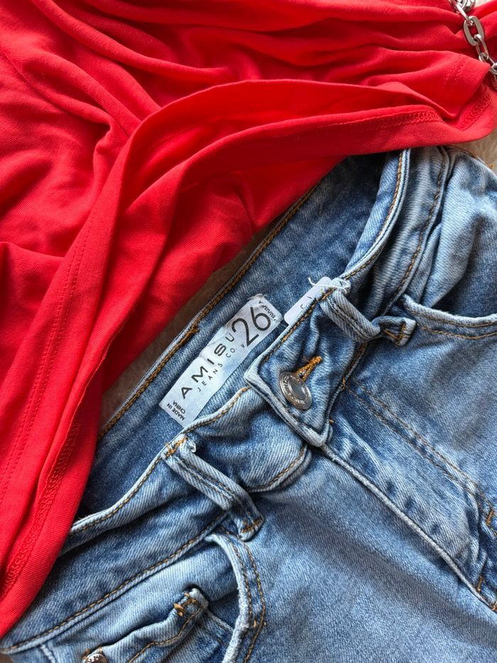 Ensemble taille S : -> Jeans Amisu taille 36 avec élastane -> T-shirt Pimkie neuf avec étiquette taille S Le tout en très bon état 📦 ENVOI SOUS 24h ⚠️ Vendu sans accessoires