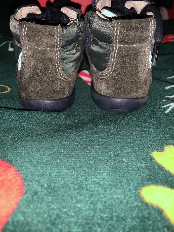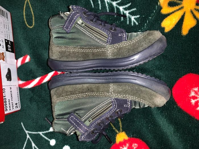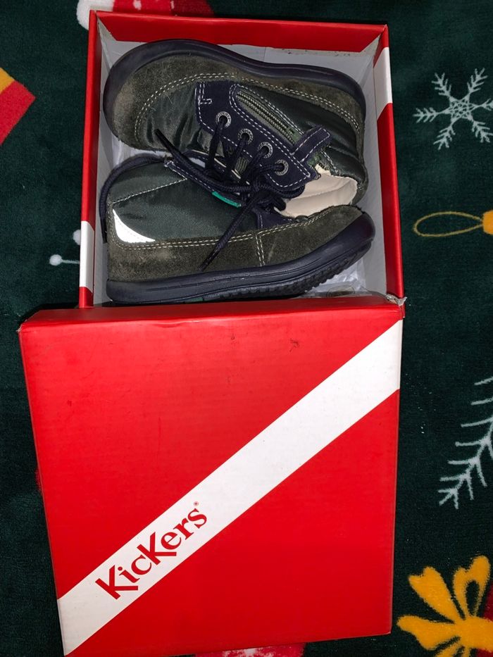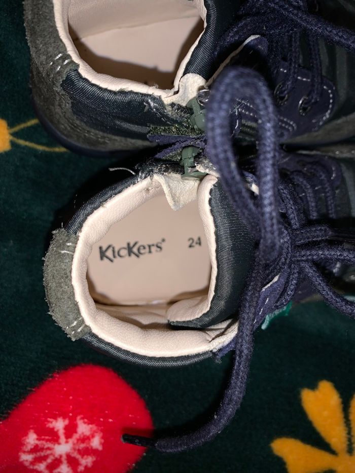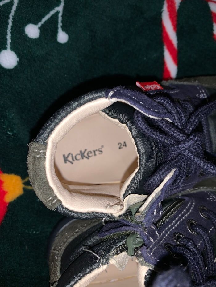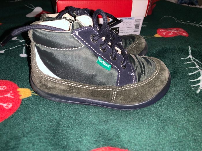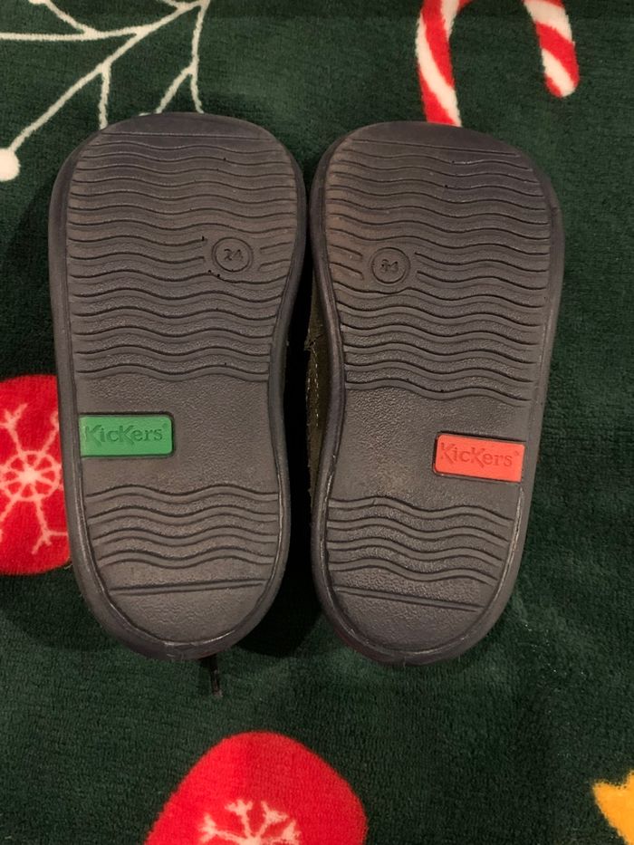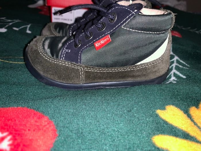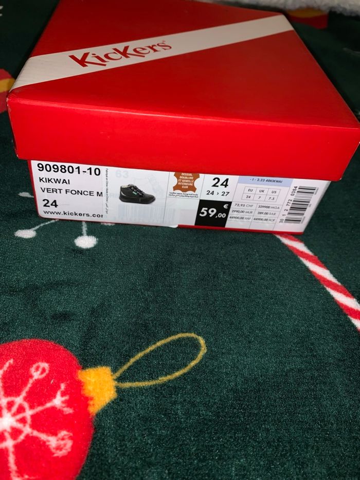 Je vends une paire de chaussures enfant Kickers modèle Kikwai, couleur vert foncé, en taille 24.