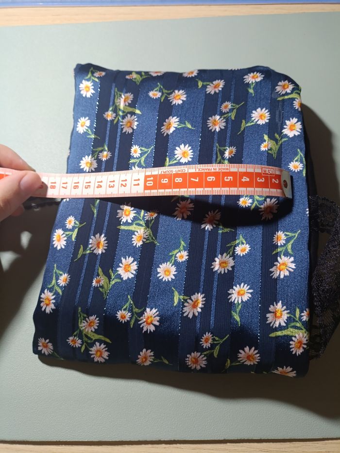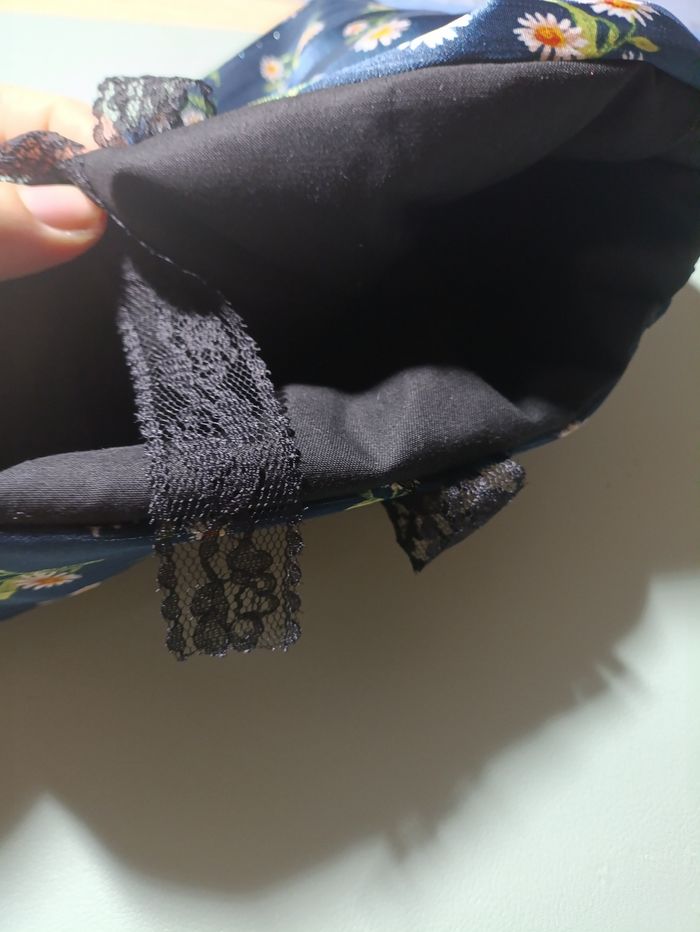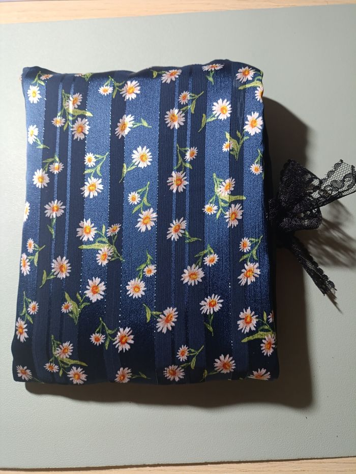 Réalisé dans un tissu marine à fleur blanche et un tissus noir intérieur.