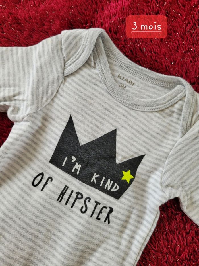 Vends joli body à manches longues pour bébé de la marque Kiabi. Taille : 3 mois. Couleur/Motif : Rayures grises et blanches. Détail : Inscription "I'm kind of hipster" avec un motif couronne noire et une petite étoile jaune. État : Très bon état. Pratique : Encolure américaine pour un passage de tête facile et pressions à l'entrejambe. Article soigné, idéal pour compléter la garde-robe de bébé. Maison non-fumeur. Possibilité de créer un lot avec d'autres articles pour optimiser les frais de port et bénéficier de réductions !