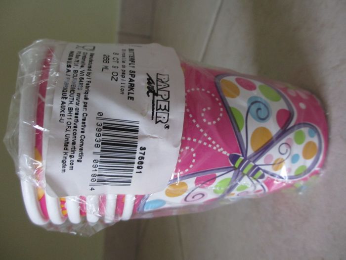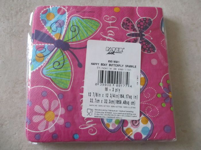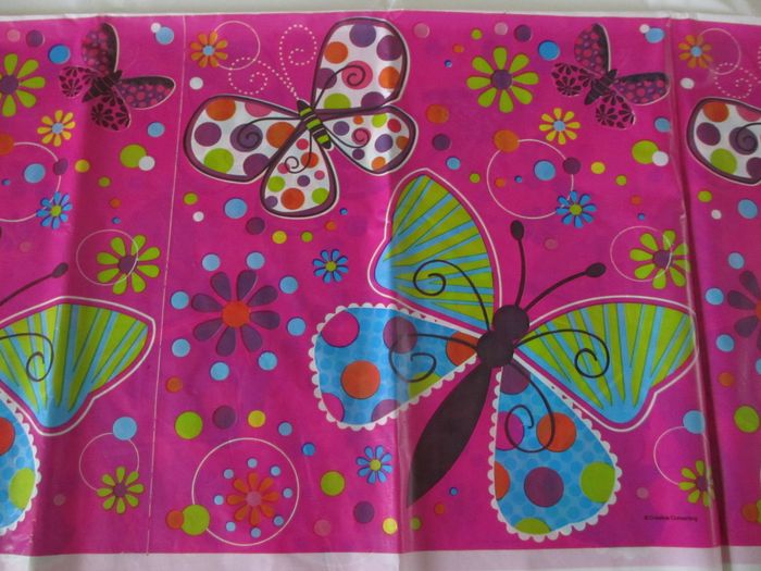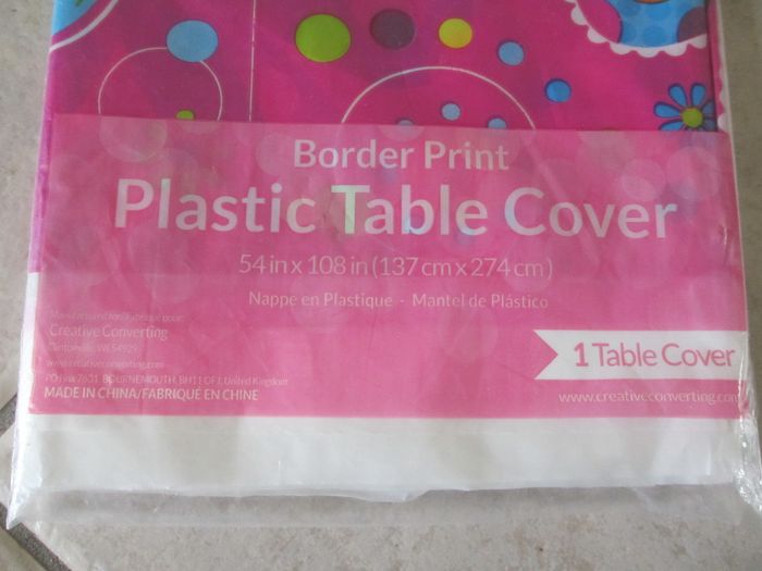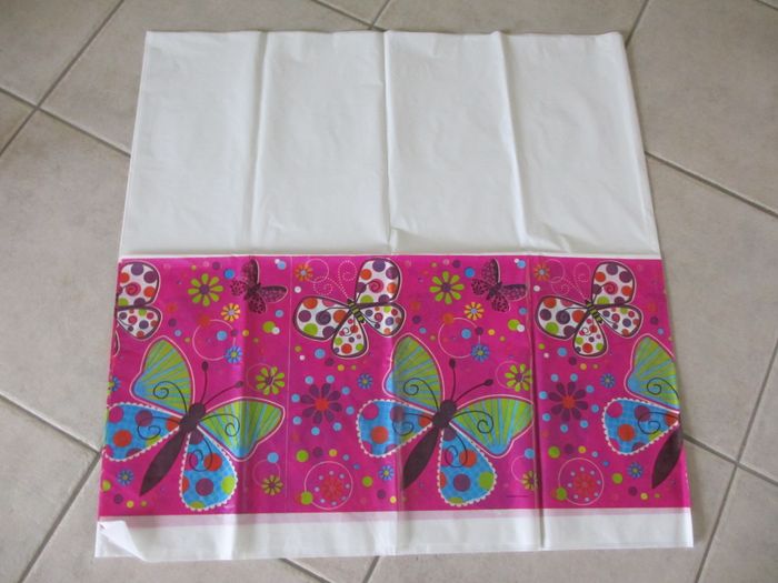 Nappe en plastique : 2,74 x 1,37 m + 13 serviettes en papier + 6 gobelets.
