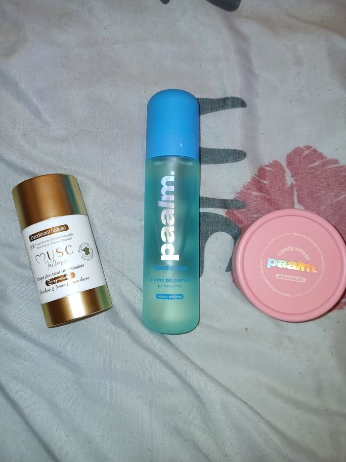 Petits lots désodorisant duo paalm et Musc intime. X1 brume de parfum island dream paalm X1 baume déodorant candidature sweet X1 deo musc intime "la rayonnante "