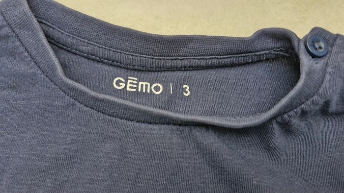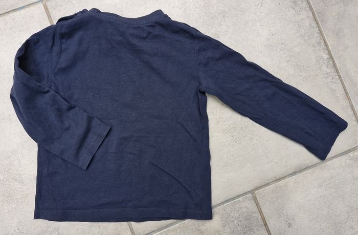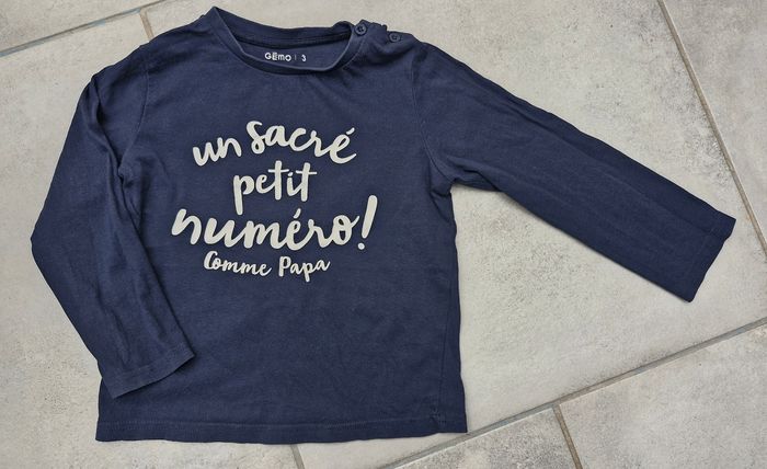 T-shirt manches longues bleu marine Gémo 3 ans avec inscription "Un sacré petit numéro ! Comme papa". En excellent état.
