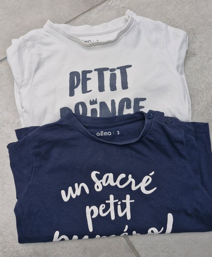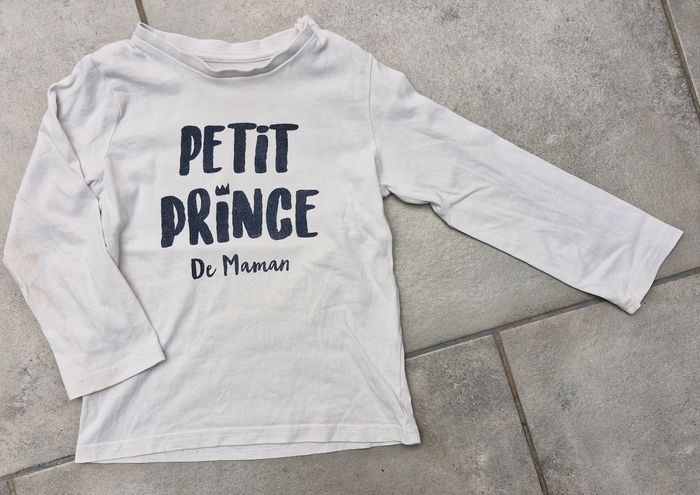 Donne en plus un autre t-shirt manches longues blanc Gémo 3 ans. Inscription "Petit prince de maman". Il présente des marques sur le bras droit et a été porté très régulièrement. Mais il peut être porté en maillot de corps ou pour jouer dehors. 😉