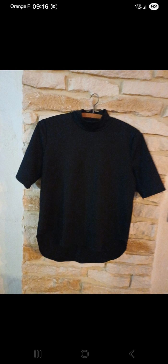 Blouse manches courtes avec fermeture éclair à l arrière. Petit col montant. Un peu plus long à l arrière qu à l avant