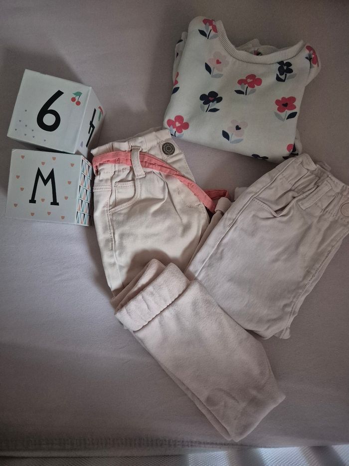 Très peu porté Lot fille 1 legging 6 mois (kiabi) porté 1 fois (interieur eponge) 2 pantalon souple rose Un pull fleur Le tout en 6 mois