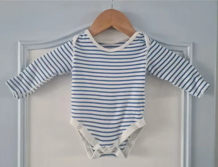 Body de marque Marks & Spencer, manches longues, taille 3 mois, 100% coton. Rayé bleu / blanc.