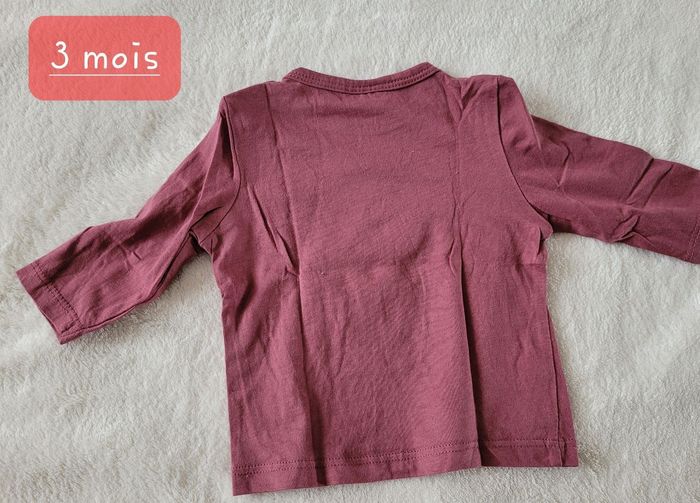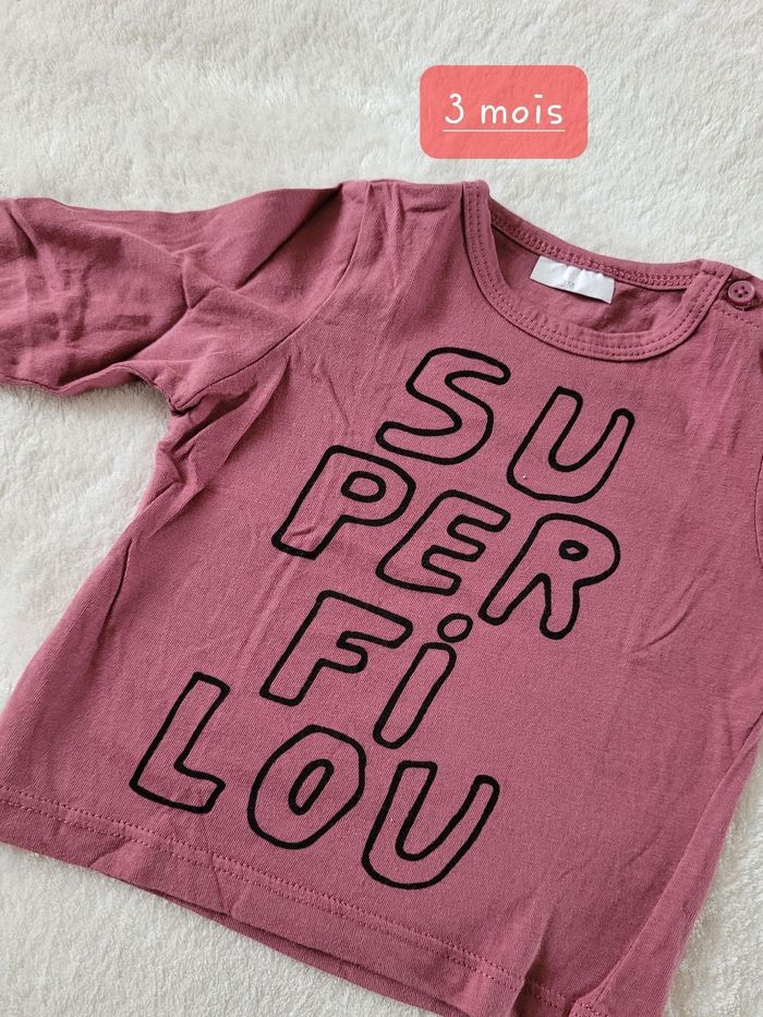 Vends t-shirt à manches longues pour bébé garçon. Taille : 3 mois / 62 cm. Couleur : Vieux rose / Prune. Message : Inscription rigolote "SUPER FILOU" en noir sur le devant. Praticité : Ouverture par deux boutons pressions sur l'épaule pour faciliter l'habillage. État : Très bon état. Vêtement confortable et idéal pour la mi-saison. Maison non-fumeur. 📦 Envoi rapide. Pensez à faire un lot avec mes autres articles en 3 mois pour bénéficier de réductions !