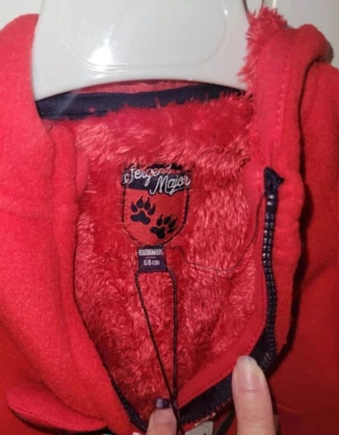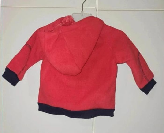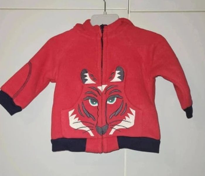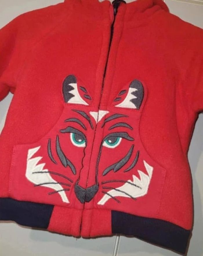 Vends magnifique veste à capuche pour bébé de la marque Sergent Major. L'article est neuf avec étiquette. Taille : 3-6 mois (68 cm). Couleur : Rouge vif avec finitions (poignets et bas) bleu marine. Design : Grand motif tête de tigre brodé sur le devant avec détails en relief (oreilles sur la capuche). Matière : Polaire très douce à l'extérieur et doublure effet "peluche" (sherpa) à l'intérieur pour garder bébé bien au chaud. Pratique : Fermeture éclair centrale sur toute la longueur. Idéal pour l'hiver ou les sorties fraîches. Maison non-fumeur.