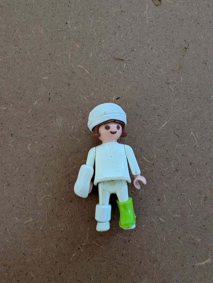 Vends lot de figurines Playmobil originales des années 70 (marquées 1974 sous le pied). Idéal pour collectionneurs ou nostalgiques. Le lot comprend : 1 Table d'examen / Lit d'hôpital blanc avec son socle gris. 1 Patient avec bandage de tête original. 1 Médecin/Infirmier avec barbe et coiffe. Accessoires de soin : une attelle de bras blanche et une attelle de jambe verte (rare en couleur). État : Bon état général pour leur âge. Les articulations sont fonctionnelles. Quelques traces d'usage normales (voir photos).