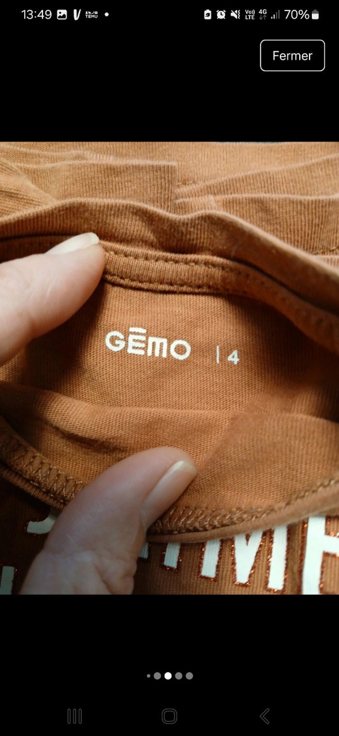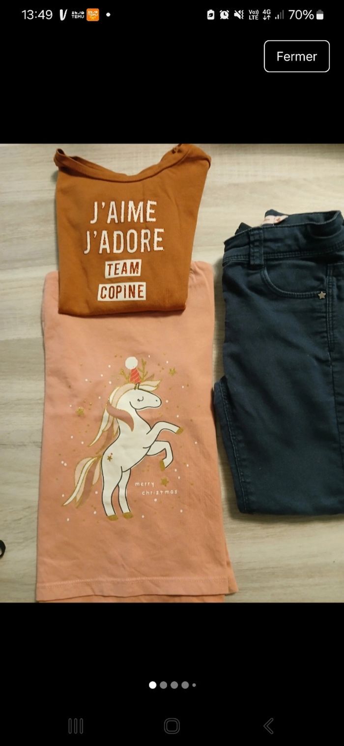 Ensemble 2 Tee-shirt manche longes 1 manches longues gemos moutarde 1 rose corail licorne kiabi quelque ombre au niveau de la licorne mais passe inaperçu pantalon gemo noir bleu petites traces au genoux