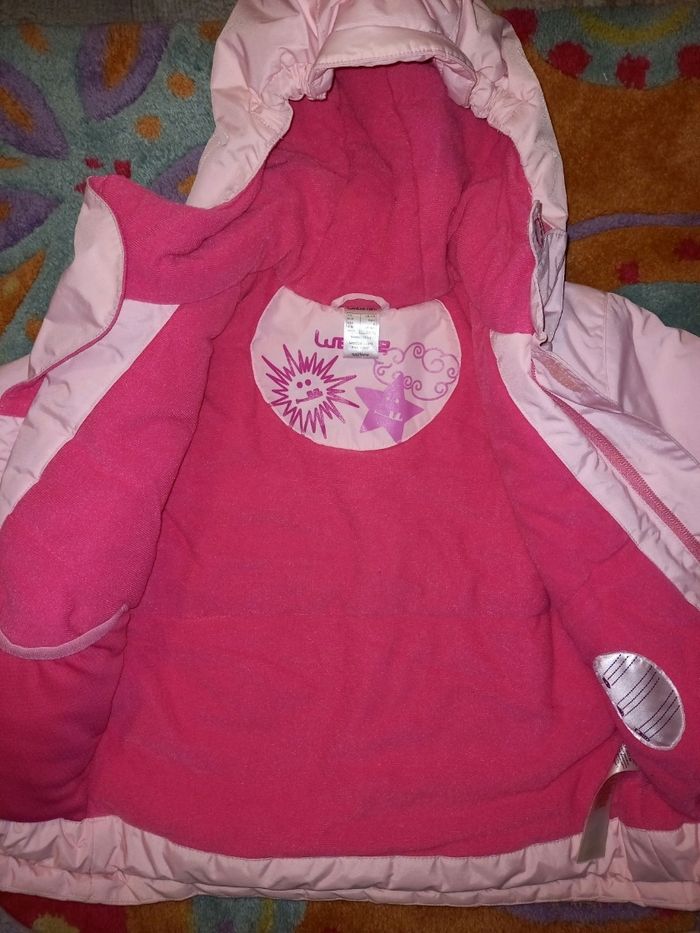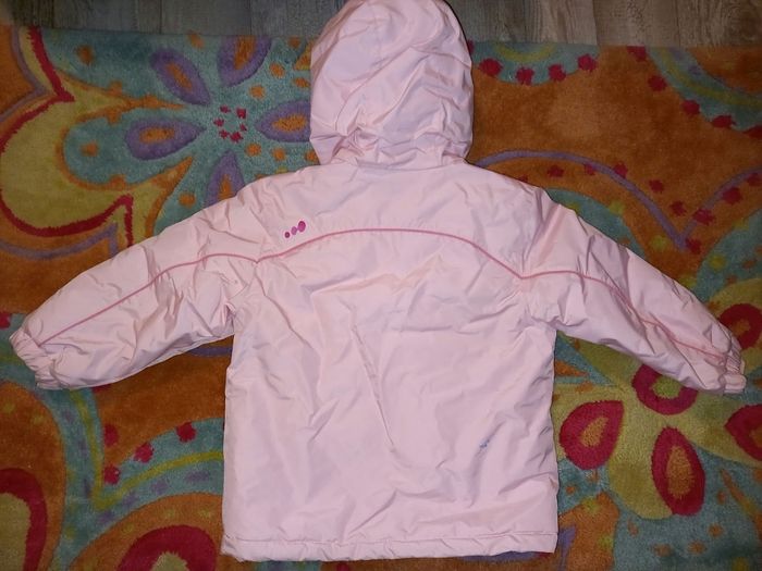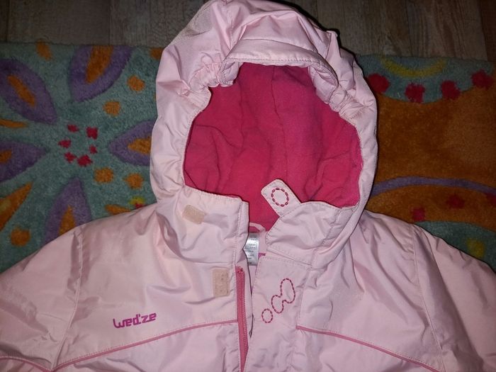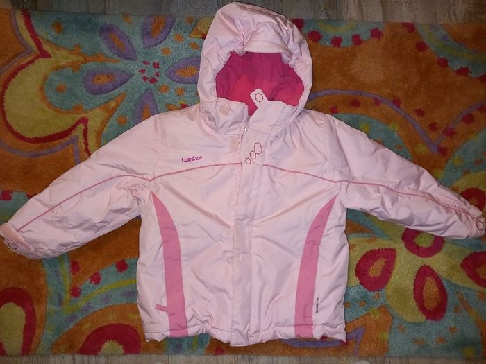 Veste (blouson) hiver pour le ski, imperméable, intérieur polaire, serrage poignet et capuche avec avancée qui s'ajuste à la tête de l'enfant pour éviter qu'elle tombe. Poche intérieure et extérieure.