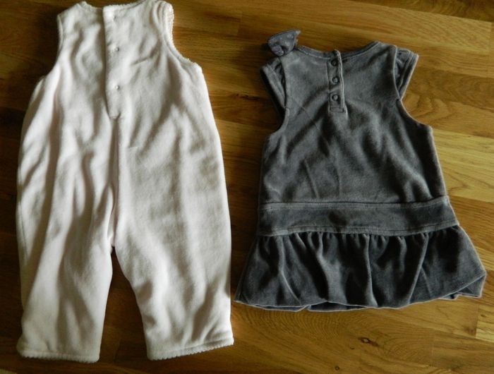 Lot en velours comprenant: *1 robe violette "Orchestra" en polyester et coton *1 combinaison rose "Bout'chou" doublée en coton et polyester Très bon état Envoie sous 48 h