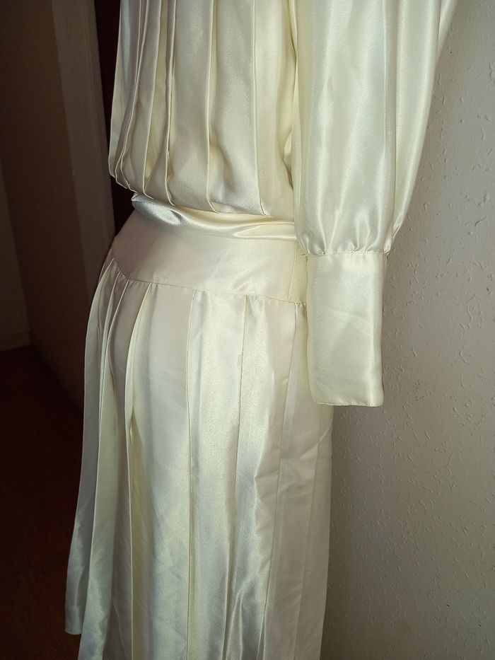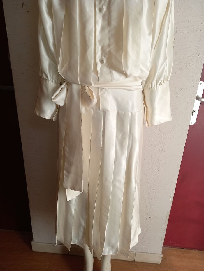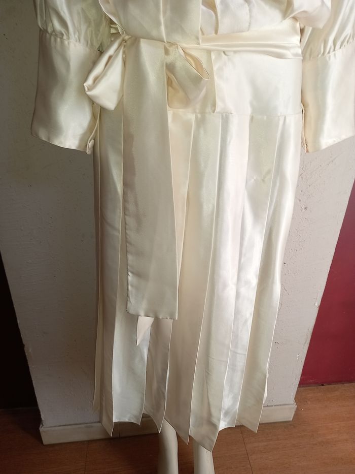 Robe longue de couleur ivoire / crème, réalisée dans un tissu polyester satiné fluide au joli tombé.