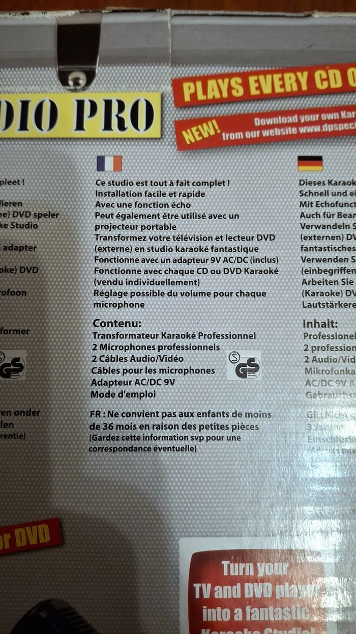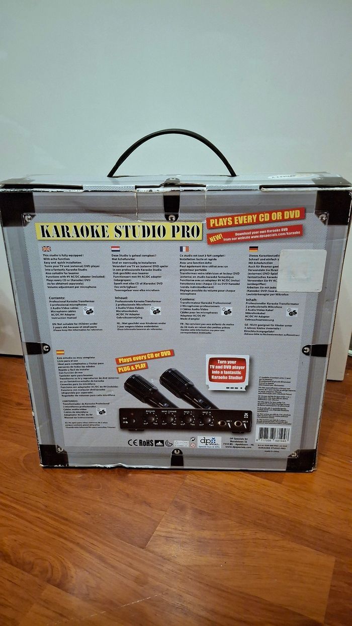 Neuf. Contient : Transformateur Karaoké Professionnel 2 Microphones professionnels 2 Câbles Audio/Vidéo Cábles pour les microphones Adapteur AC/DC 9V. Mode d'emploi Idéal comme cadeau pour les fêtes.