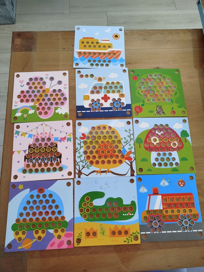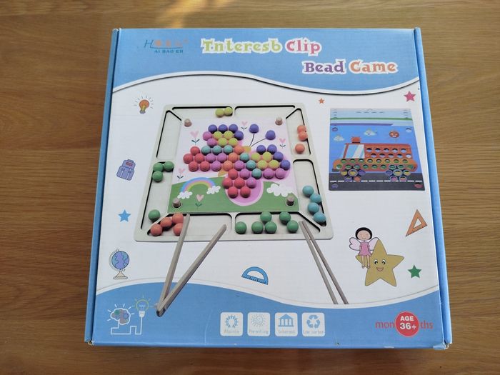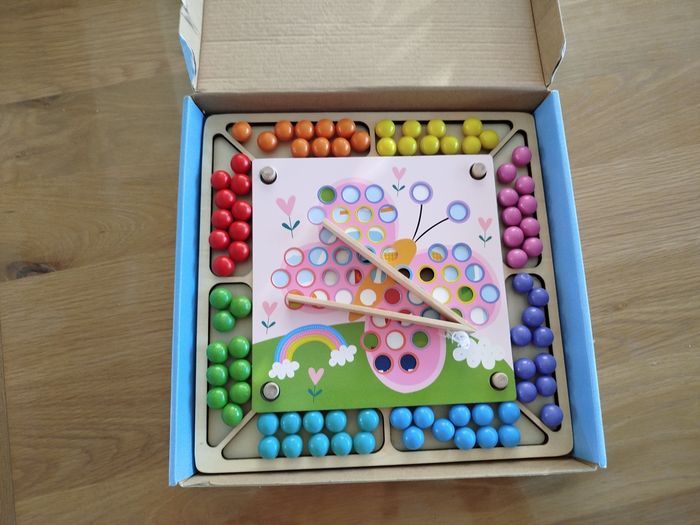 Jeu éducatif en bois consistant à placer des perles en bois sur la couleur correspondante pour recréer un dessin. 8 couleurs avec 10 perles chacune, soit 80 perles.