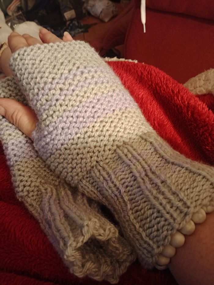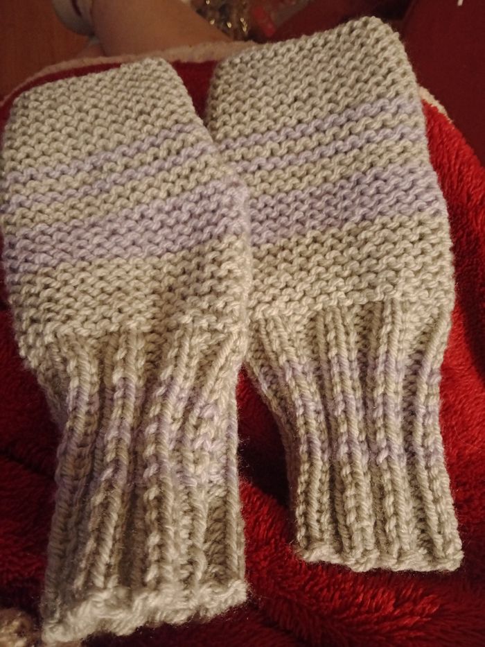 Mitaines tricotées main en laine, grises et mauves. Modèle inventé unique. Neuves.