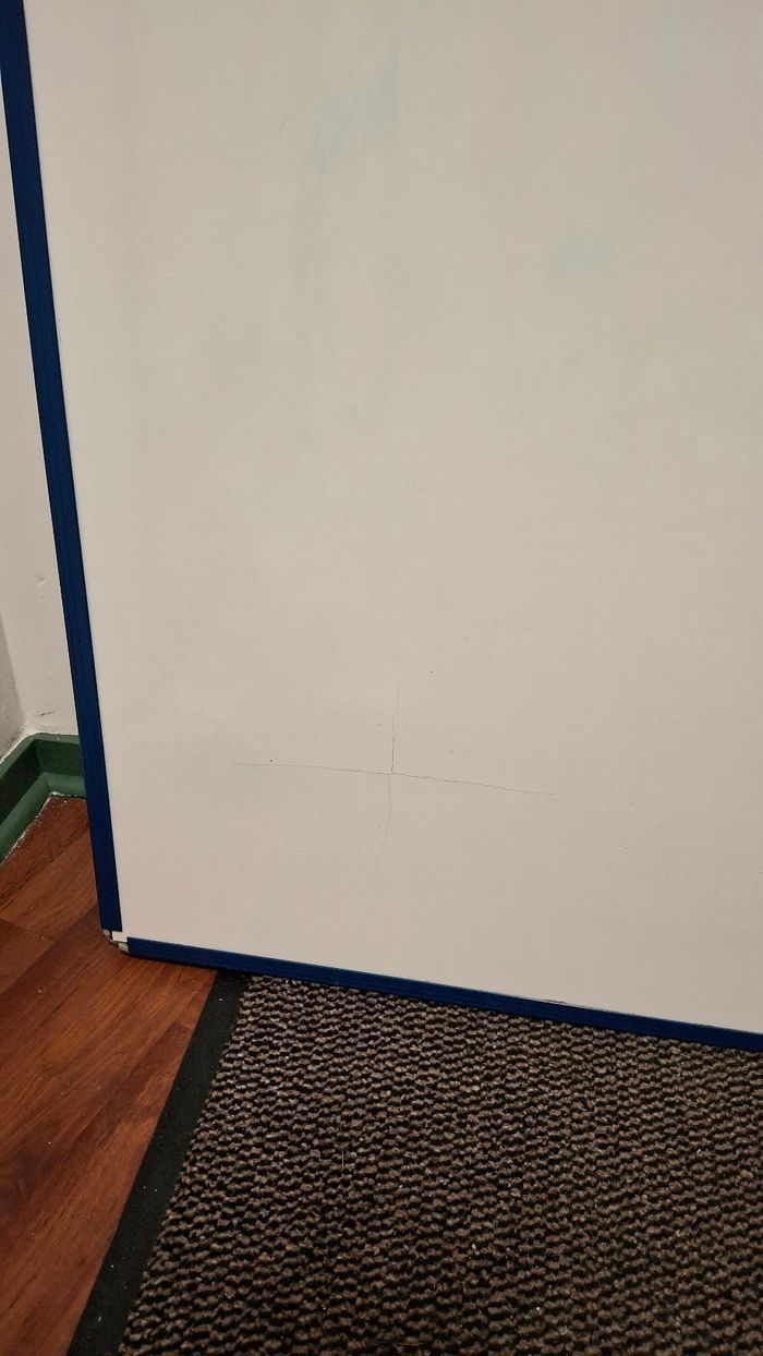 Très pratique pour les étudiants, posé par terre en format portrait, ur un bureau en format paysage, ou fixé au mur avec ses 4 trous. Présence d'une fissure en bas d'un seul des 2 côtés du tableau.