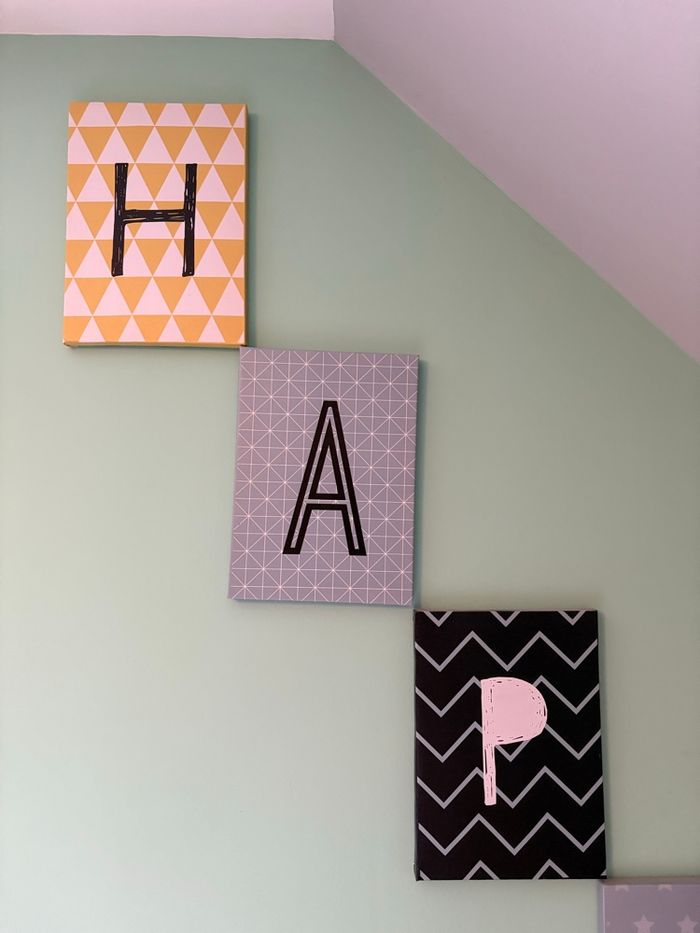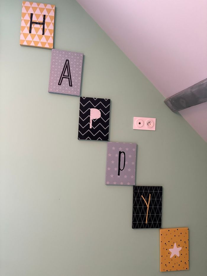 Les lettres composent le mot HAPPY et peuvent être accrochées comme on veut : dans l’ordre, en décalé, en ligne ou en colonne selon vos envies.