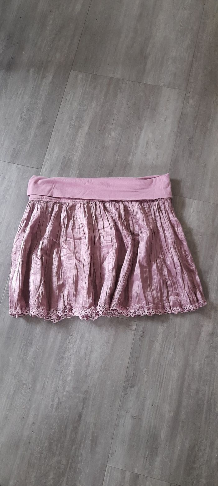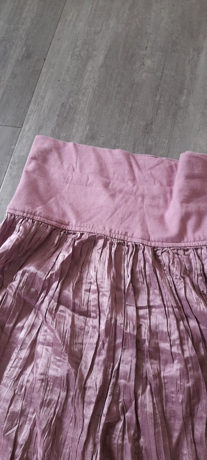 Rose grisé, en matière fluide brillante, doublure en coton. Ceinture douce extensible et retroussable, s'adapte au corps. Neuve, taille 38