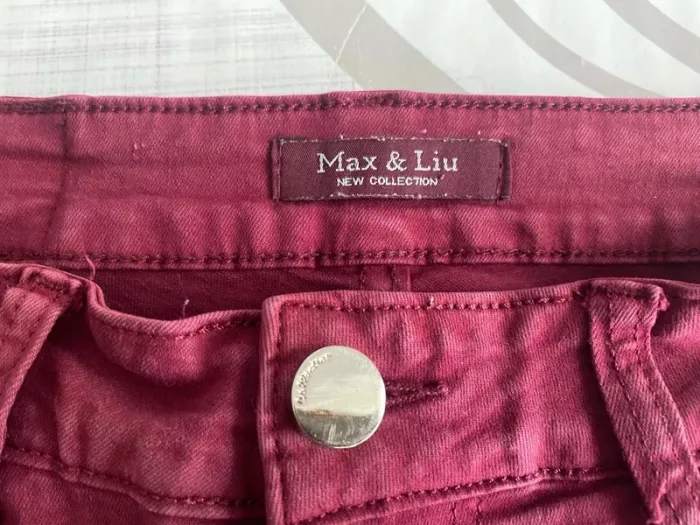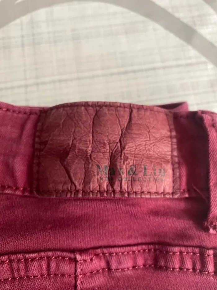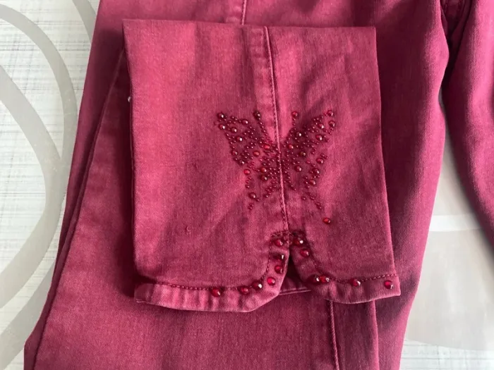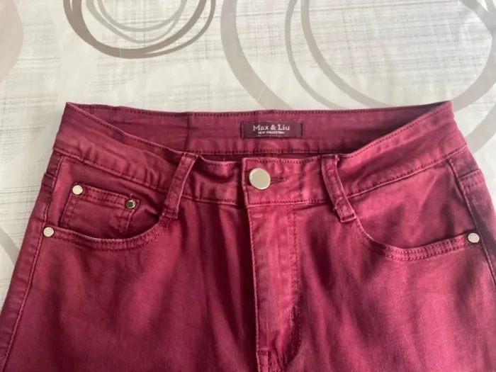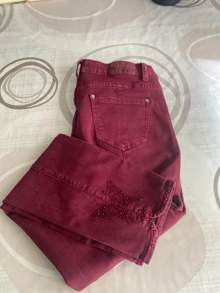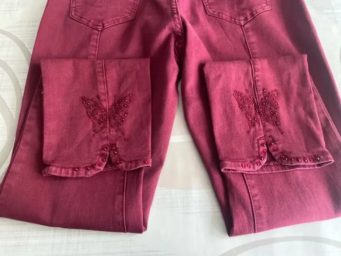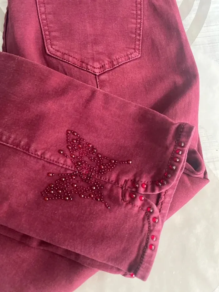 Joli pantalon, fantaisie Papillon en strasse au bas du pantalon Marque Max et Liu Taille 38 98 % coton. 2 % élasthanne Couleur rouge bordeaux