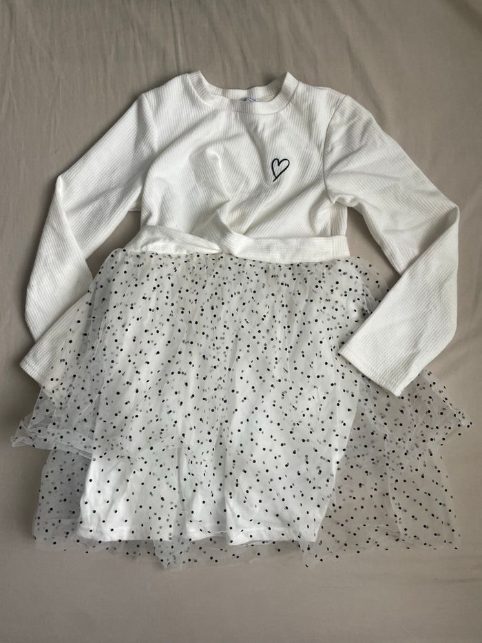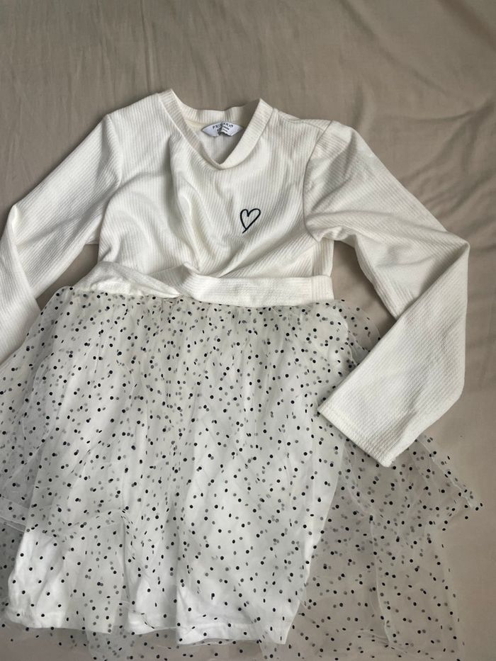 Je vends cette jolie robe de soirée pour fille de 6-7 ans, en blanc avec un motif de petits points noirs.
