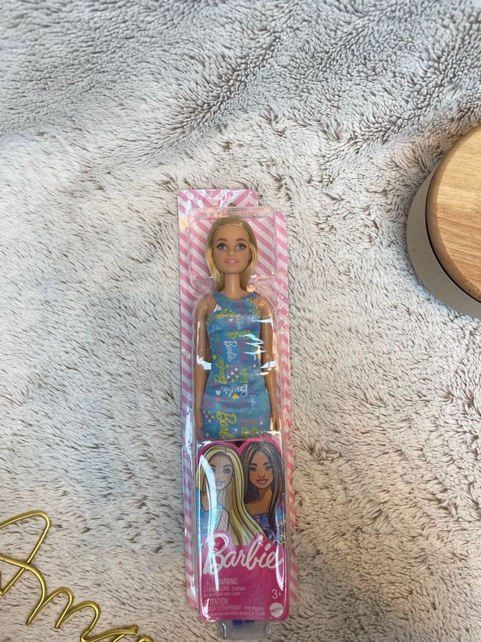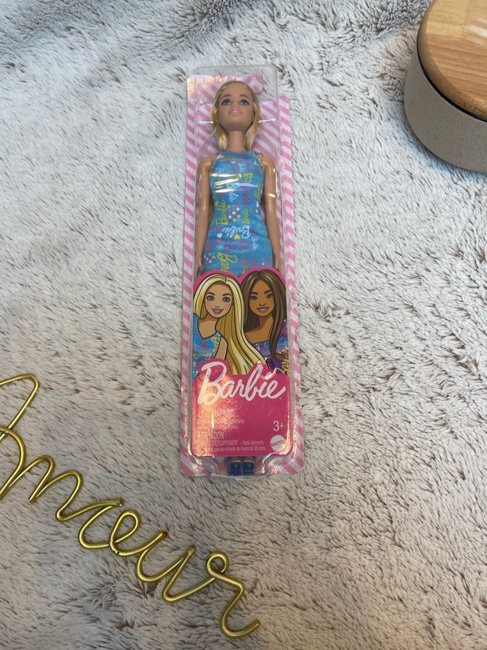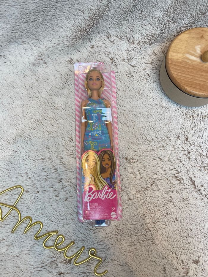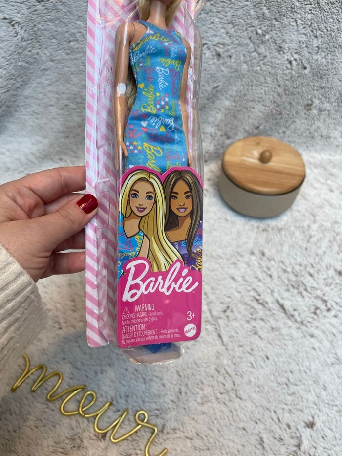 🎀 Poupée Barbie neuve – Robe bleu avec logo Barbie 🎀