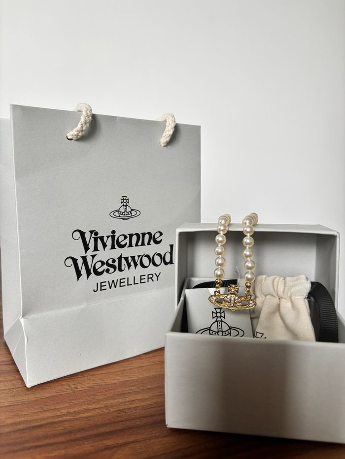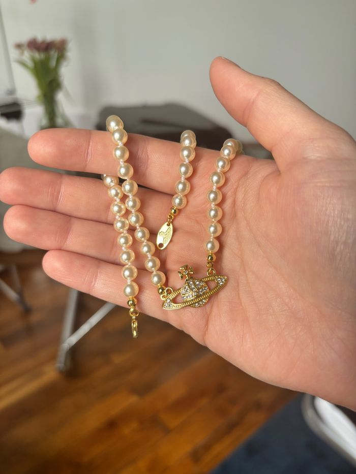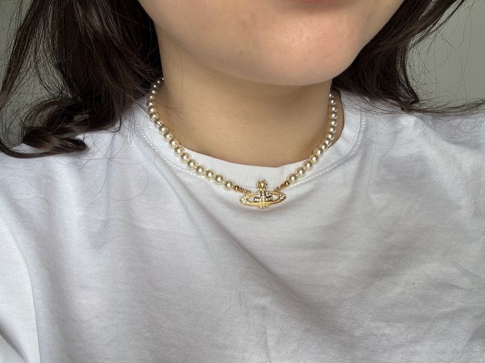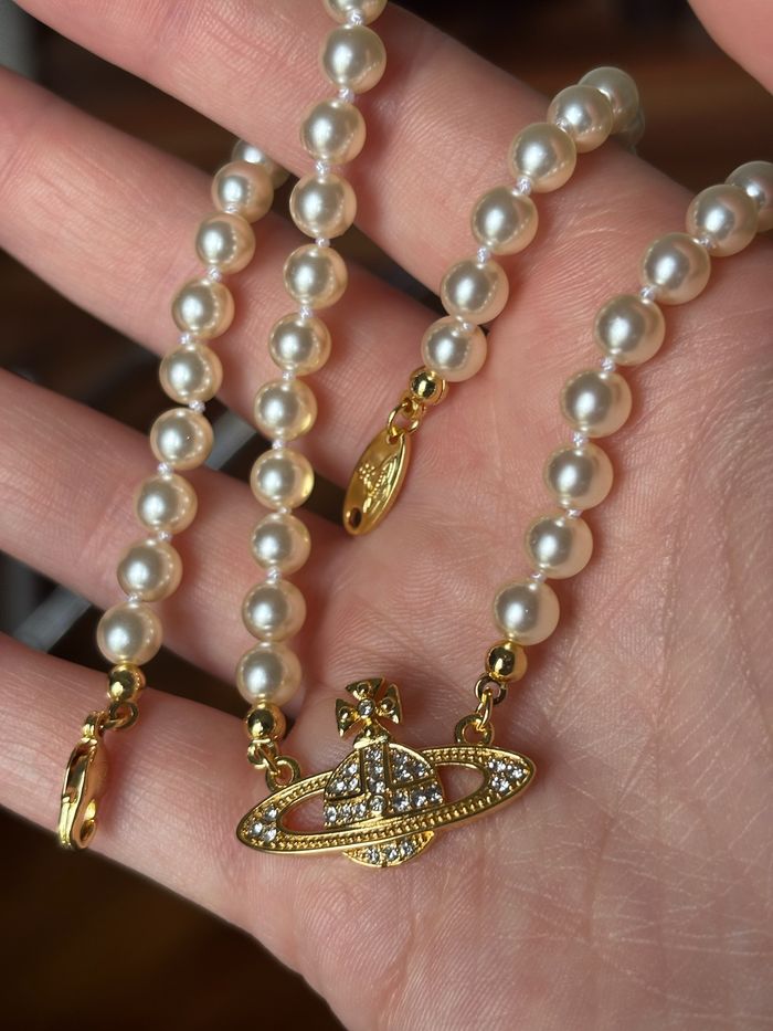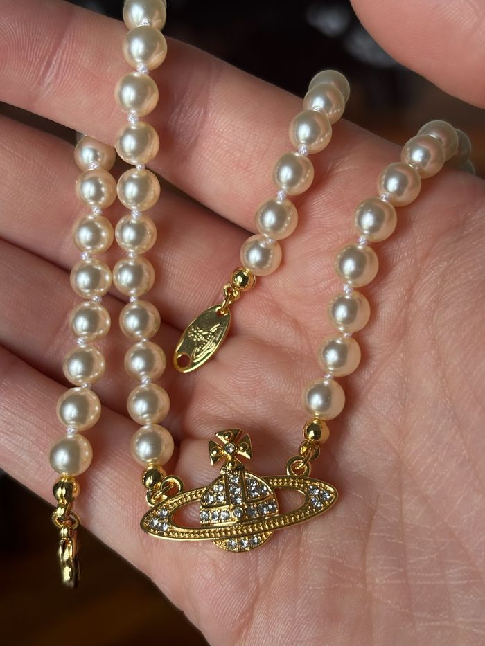 Sublime collier signé Vivienne Westwood, modèle emblématique avec pendentif doré clair et cristal Topaze Colorado. Un bijou élégant et intemporel, parfait pour sublimer vos tenues.
