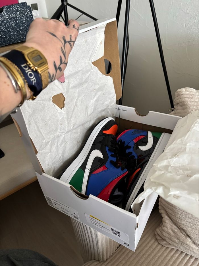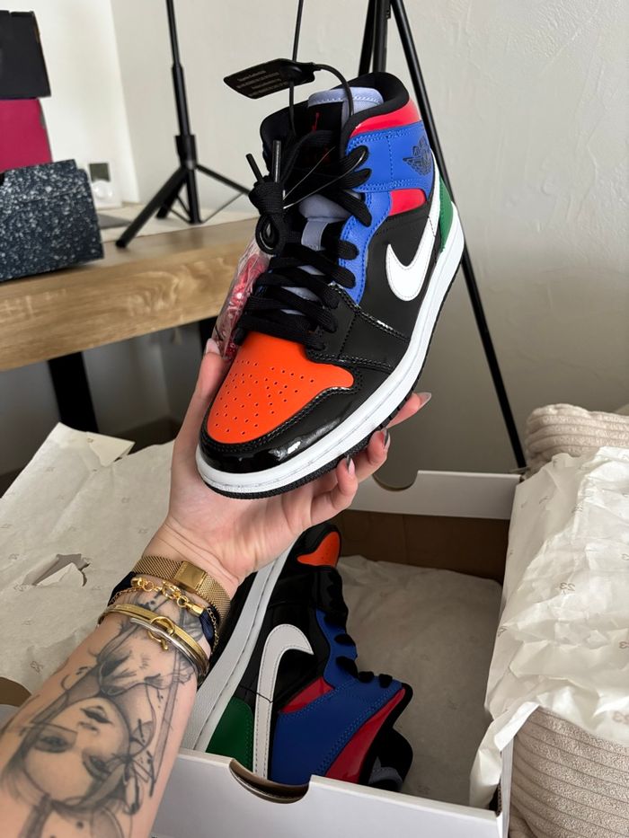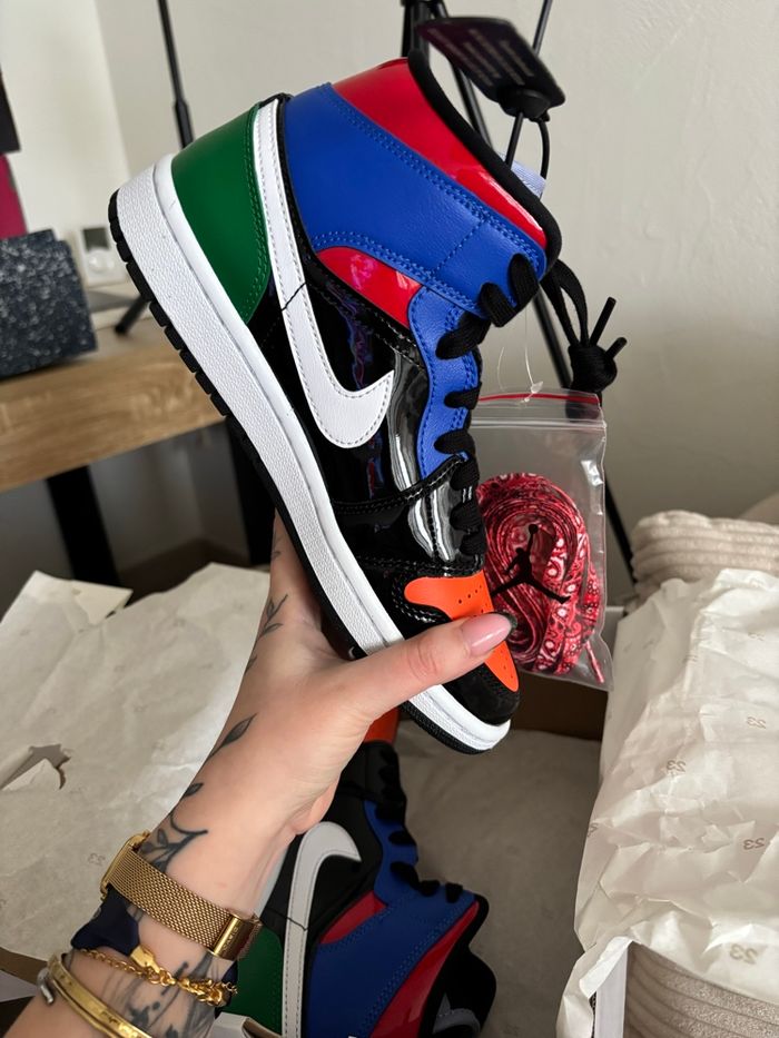 Ambiance old school 90’s / street vintage : je vends une paire de Air Jordan 1 Mid SE “Multi-Patent” avec un mix de couleurs ultra iconique (noir + blanc + toe box orange + touches bleu/rouge/vert) et surtout une finition cuir verni qui capte la lumière trop bien ✨