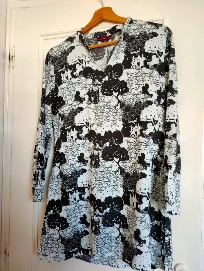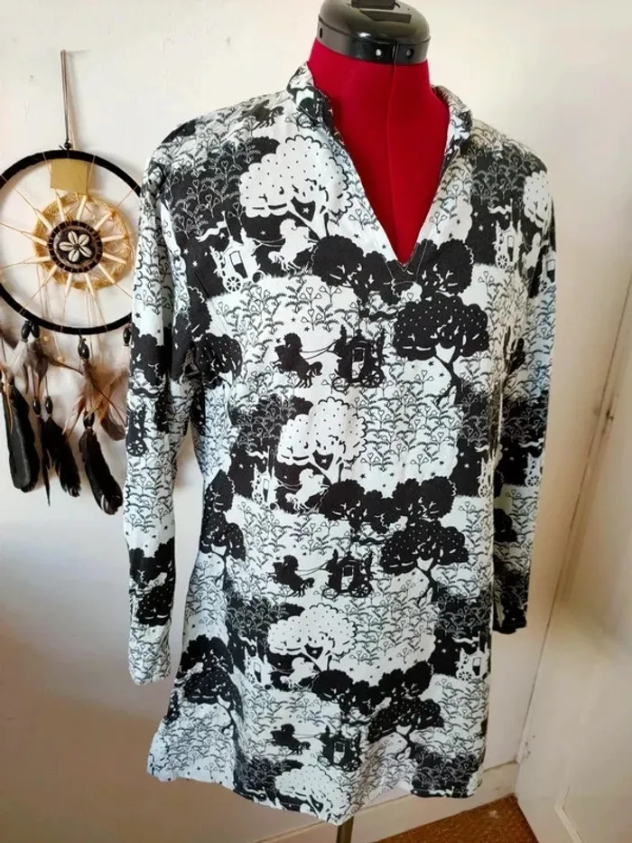 Tunique légère et fluide Largeur à plat sous les aisselles 52 cm Largeur épaule 44 cm Largeur taille 47 cm Largeur bas de la tunique 64 cm Longueur totale 81 cm Fendue des deux côtés sur le bas Manches longues Portee une saison #geliscyrilletailleL #geliscyrilletaille40 ##c12