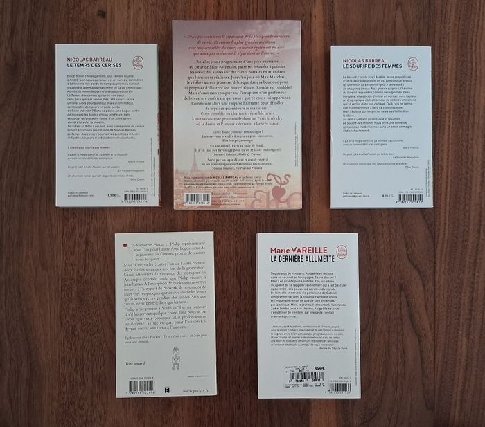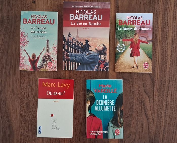 Nicolas Barreau Sous le pseudonyme de Nicolas Barreau se cache un auteur franco-allemand qui travaille dans le monde de l’édition. 1 roman format Broché ✏️ La vie en Rosalie Editions Héloïse d'Ormesson Prix éditeur : 19 € 2 au format poche Très bon état Edition Le livre de poche ✏️ Le sourire des femmes Prix éditeur : 8,70€ ✏️ Le temps des cerises (suite du sourire des femmes) Prix éditeur : 8,90€ La dernière allumette (VENDU) Marie Vareille ✏️ Où es tu ? Marc Levy Edition Pocket Très bon état Prix éditeur : 8,70€ Le lot est personnalisable. Le sourire des femmes et Le temps des cerises forment un lot indissociable.