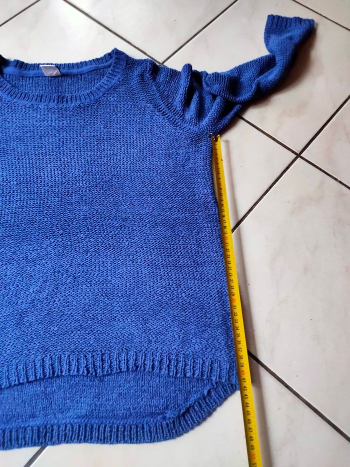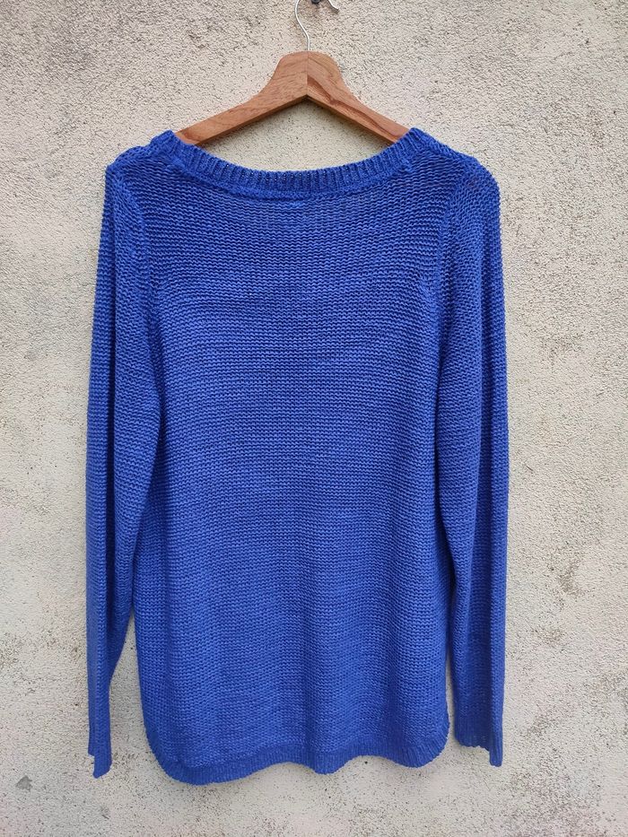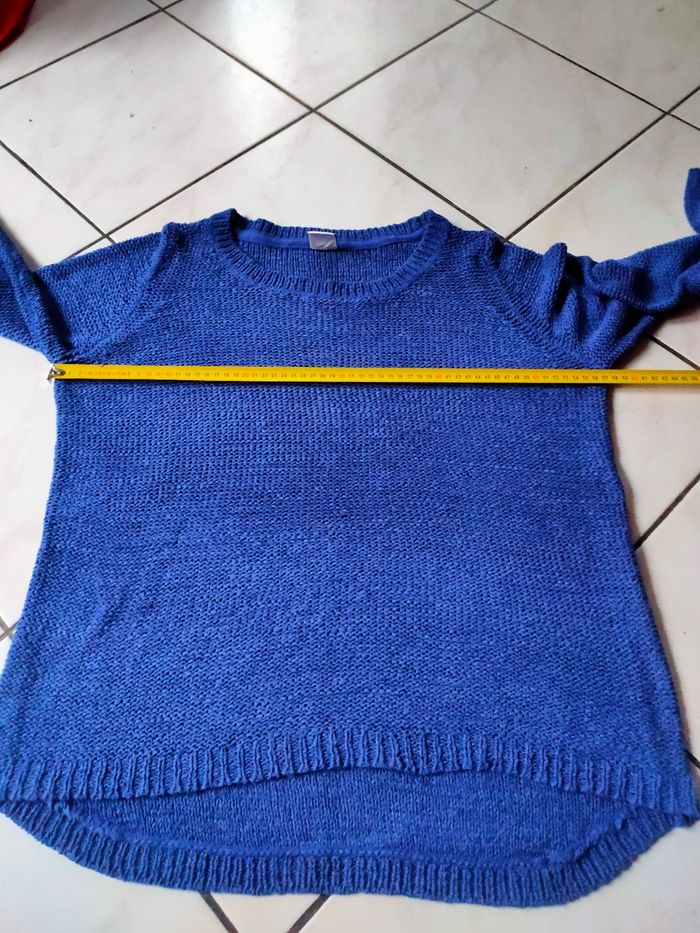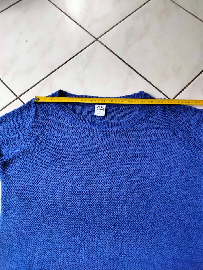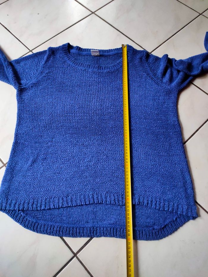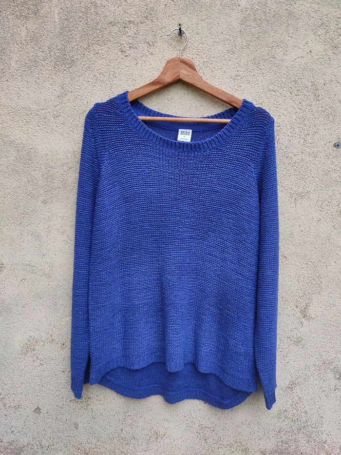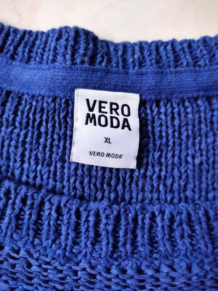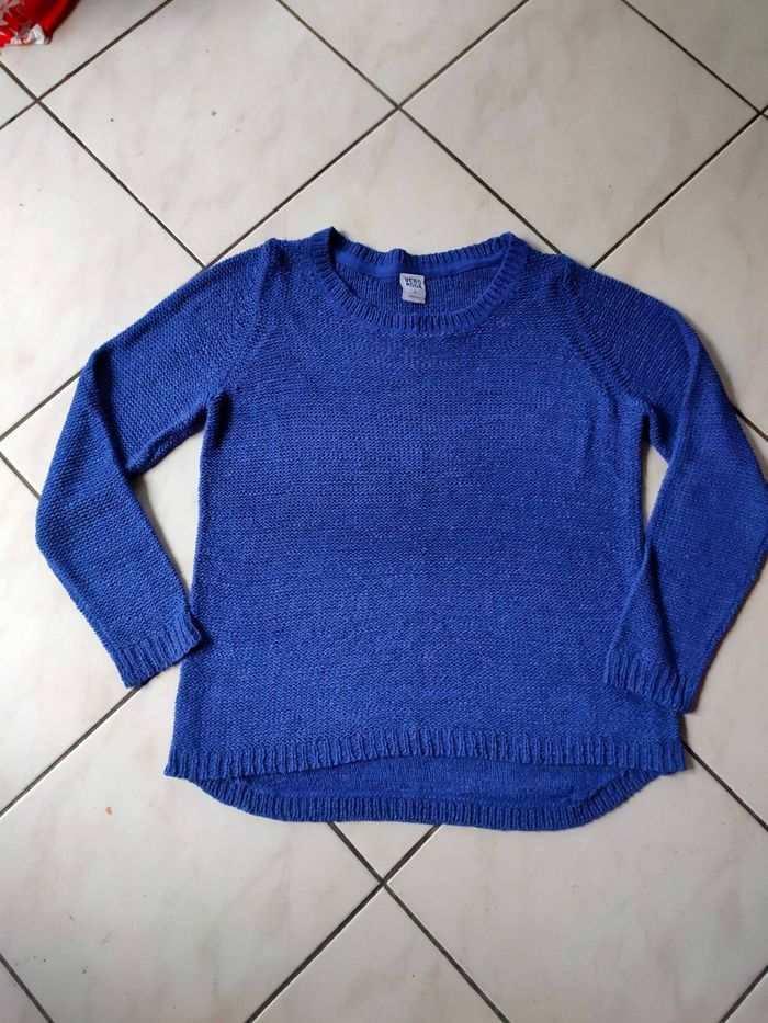 Pull bleu en maille, coloris bleu, col rond, manche longue. Marque Vero Moda, modèle très ancien car les étiquettes ne sont plus les même aujourd'hui. Taille XL mais je trouve qu'il taille grand, il peut je pense convenir a un 44 FR, les mesures sont détaillées dans l'annonce et en photo, je vous recommande de comparer les mesures de votre côté afin d'éviter les déconvenue! L'étiquette composition a été coupé car elle était gênante. Il est en très bon état.
