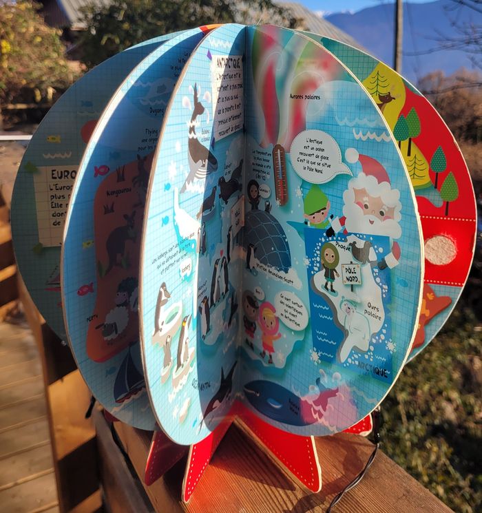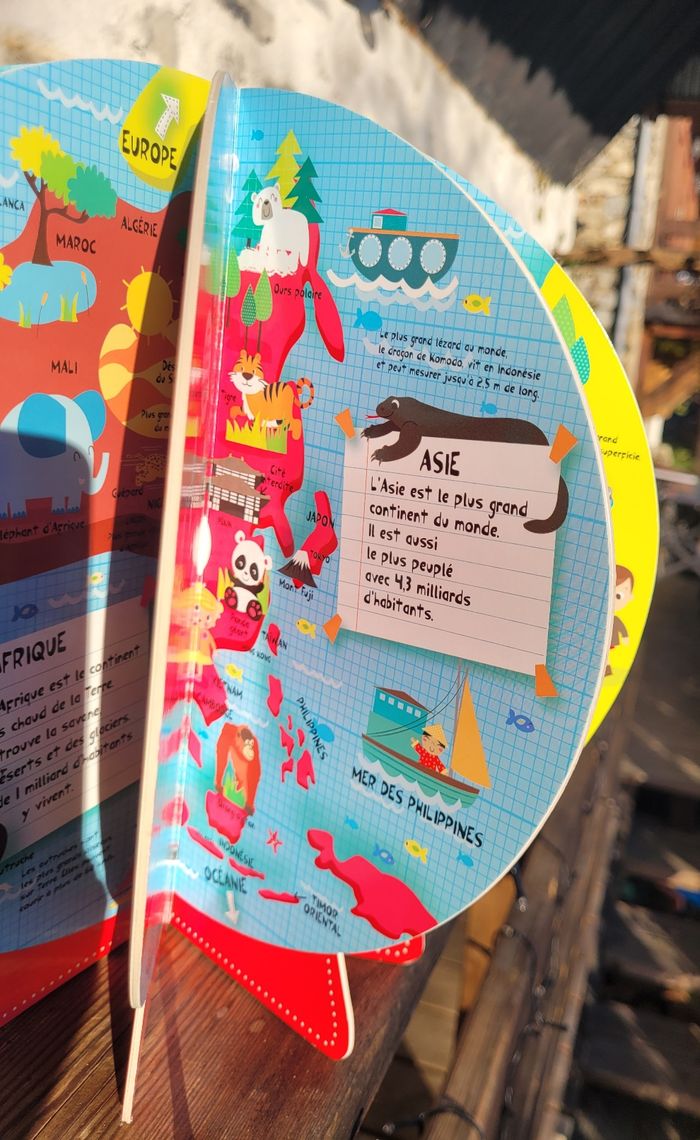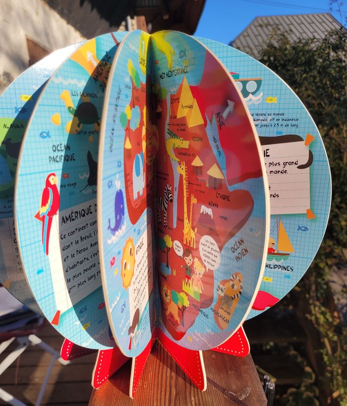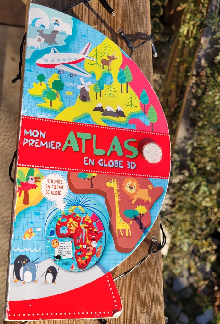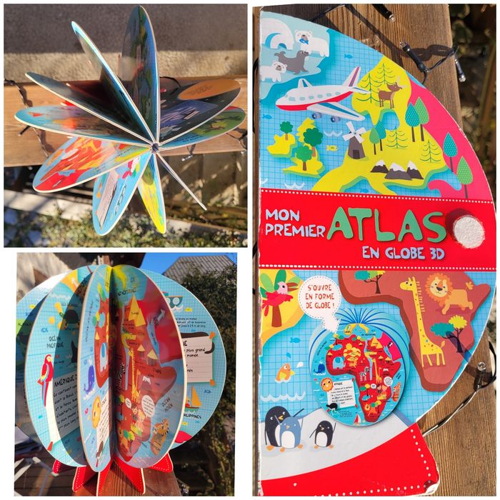 MON PREMIER ATLAS EN GLOBE 3D Un premier atlas en forme de globe, pour découvrir les continents, les pays, les animaux et les sites remarquables. Les couvertures forment un globe en 3D qui tient debout. En très bon état, il manque le velcro pour tenir fermer mais il tient très bien tout de même Mes autres livres enfants : #livreenfantmooglou