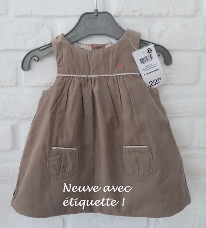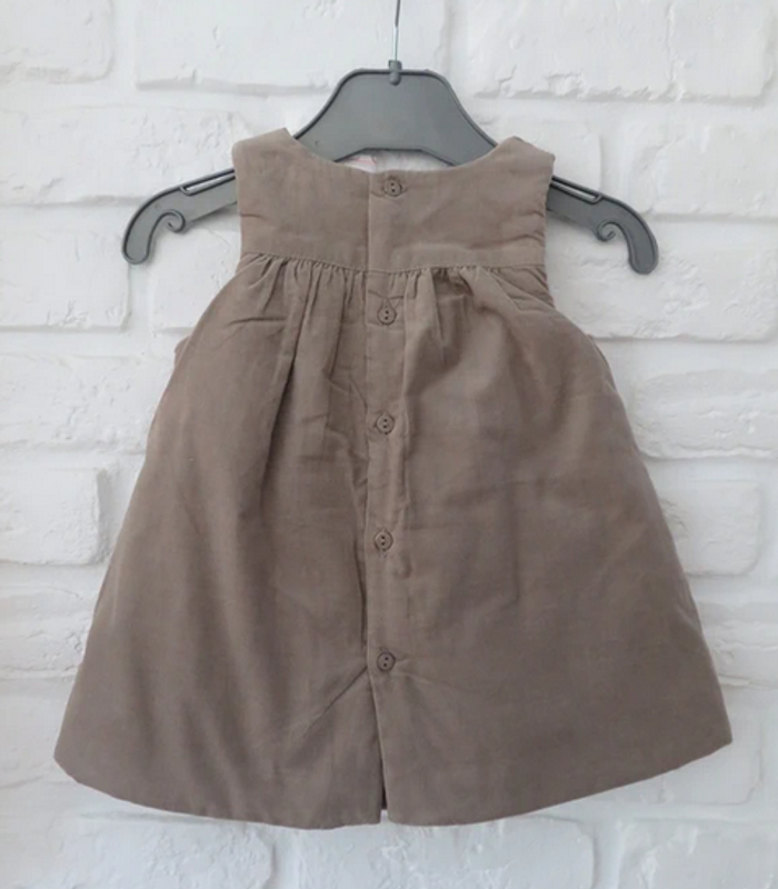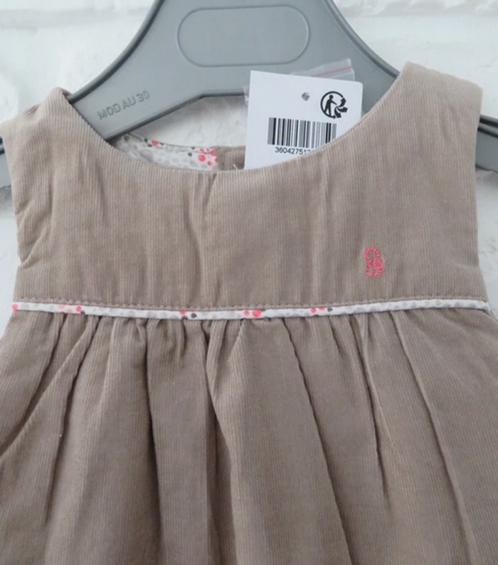 Jolie petite robe Obaïbi en velours, couleur "taupe clair" ou "beige foncé", collection hiver (doublure bien épaisse), très belle qualité et finition, jusqu'au détail des petits boutons au dos. A associer par exemple à un petit sous pull blanc ou rose pâle pour le rappel des liserés sur la poitrine et sur les poches. Taille 3 mois. NEUF avec étiquette, état parfait !