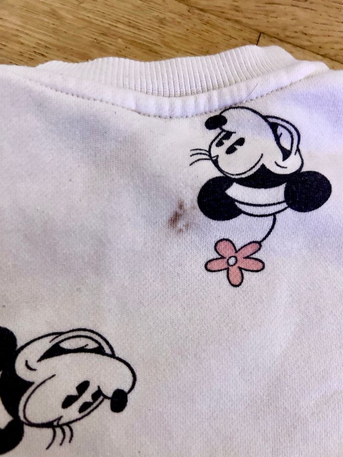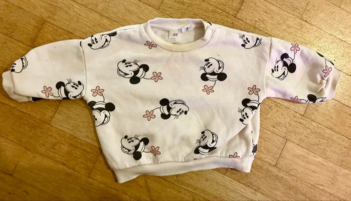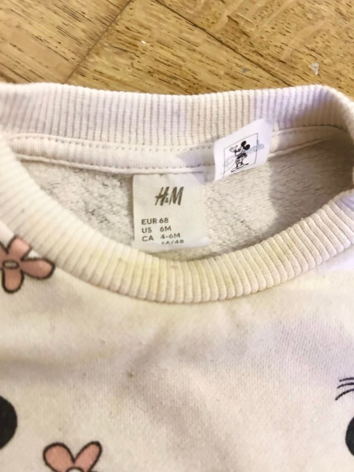 Joli ensemble composé d’un pull type sweat et d’un pantalon assorti de la marque H&M. Motif : Imprimé Minnie Mouse et petites fleurs roses. Matière : Coton épais, l'intérieur est légèrement molletonné/tout doux, idéal pour garder bébé au chaud. Taille : 6 mois (68 cm). État : L'ensemble ne présente aucun trou. À noter cependant la présence de quelques taches (visibles sur les photos, notamment sur le devant du pull) qui ne sont pas parties au lavage habituel. Idéal pour une tenue confortable à la maison ou comme tenue de rechange pour la crèche/nounou ! Note : Maison non-fumeur. Envoi rapide et soigné. D’autres articles bébé disponibles dans mon dressing. #hm #hmbaby #disney #minnie #minniemouse #6mois #taille6mois #bebefille #ensemblebebe #sweatbebe #joggingbebe #tenuebebe #petitprix #videdressingbebe #tenuecreche #vetementbebeoccasion
