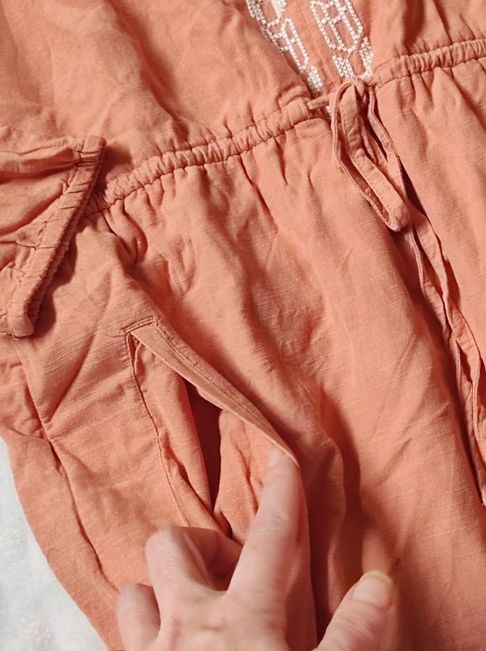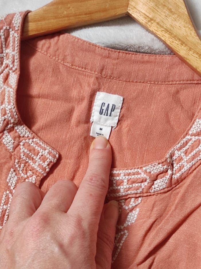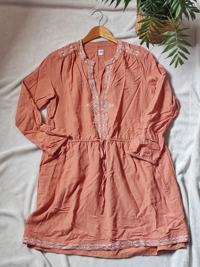 Robe tunique couleur pêche , style aztèque a manches longues avec poches latérales. Décolleté ouvert en V, cordon au niveau de la taille pour ceintré et affiner la silhouette. Élastique aux bouts des manches. Couleur plus vive qu'en photo ( la 2eme s'en rapproche). Marque gap en taille M / 38. En parfait état, ni trou tâches ou déchirures.