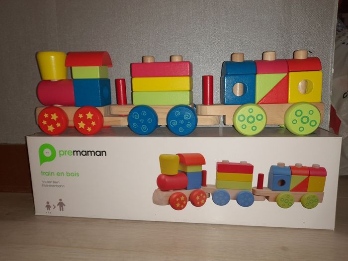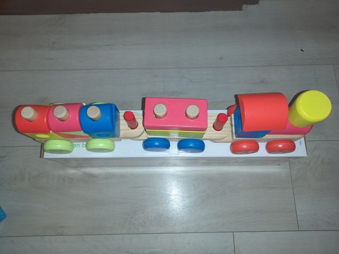 Ce train en bois est composé de différentes formes géométriques colorées qui peuvent être empilées et assemblées de multiples façons. Il comprend également des roues qui permettent à l'enfant de le faire rouler. Les pièces sont en bois de qualité et offrent une belle finition.