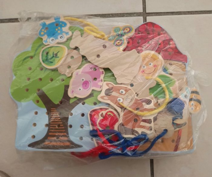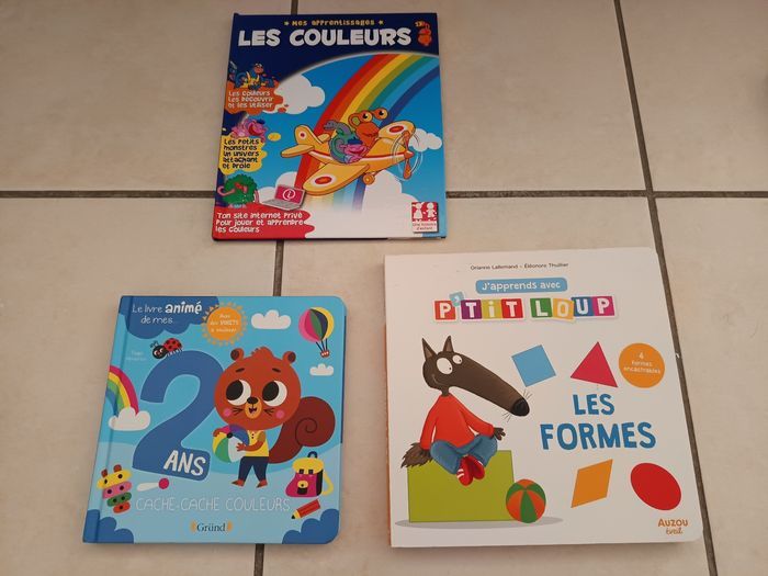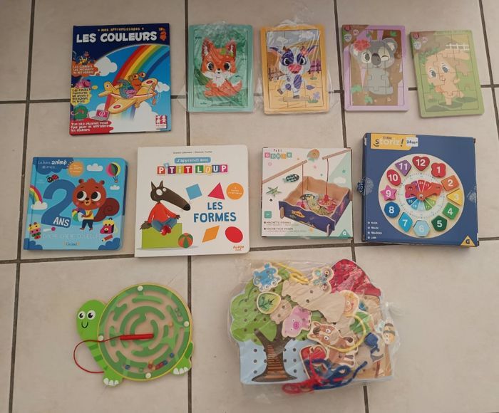 Propres et désinfectés Usure normale 4 puzzles donc 2 neufs 1 livre sur les couleurs 1 jeu de pêche aux poissons ( aimanté et démontable) 1 jeu de forme et de chiffre pour l'heure 1 jeu de billes aimantées 1 livre sur les formes 1 livre avec des volets à tirer 1 jeu de motricité fine avec lacets a enfiler avec personnage et décors
