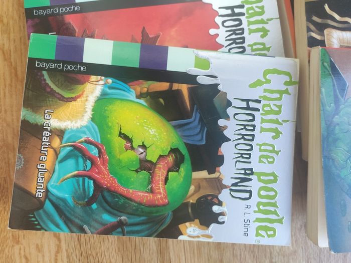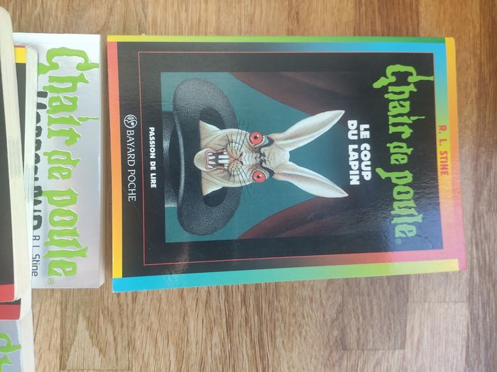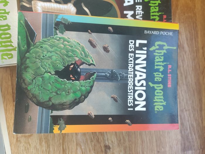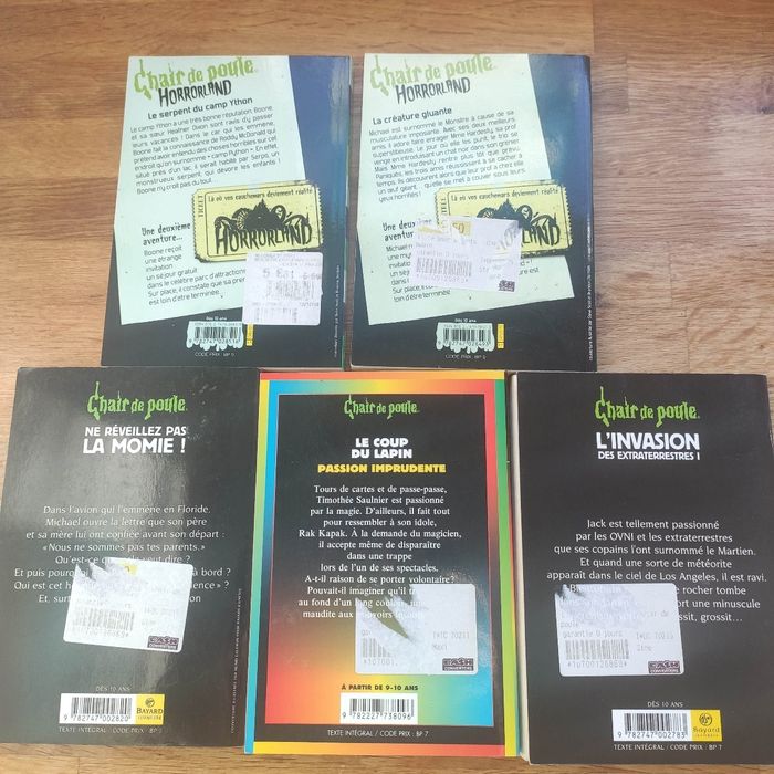 Trois tomes Chair de poule : L'invasion des extraterrestres, Le coup du lapin, Ne réveillez pas la momie. Avec deux Chair de poule Horrorland : Le serpent du camp Ython et La créature gluante. Les livres sont en bon état, avec des étiquettes de prix collées au verso, certaines couvertures sont un peu pliées, la tranche des pages a un peu jauni avec le temps